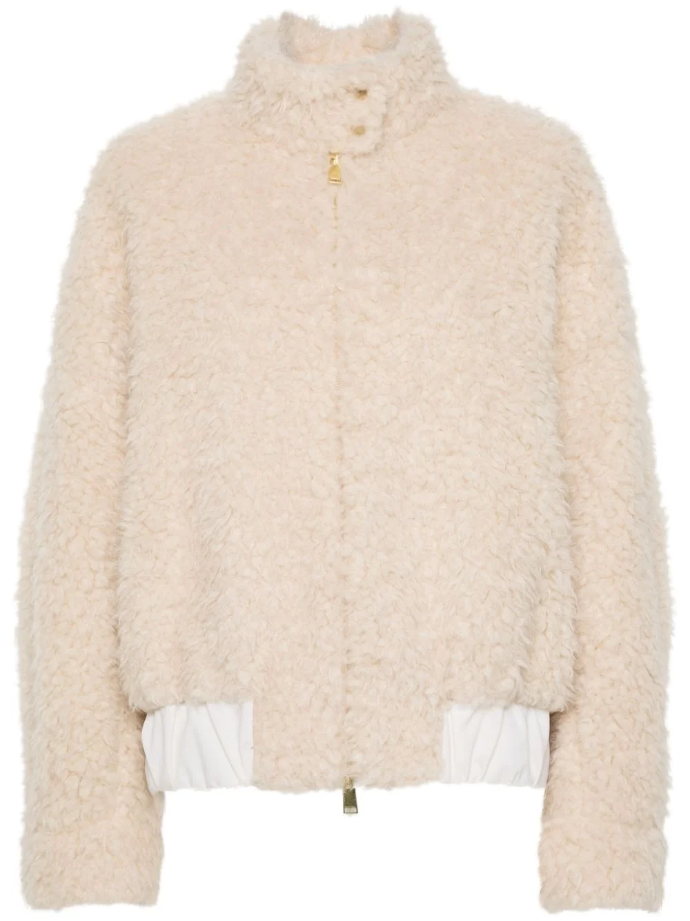 Lee bomber jacket Highlights - Off-white - Virgin wool blend - Faux-fur design - Front two-way zip fastening - High neck - Long sleeves - Press-stud fastening cuffs - Two side welt pockets - Storm flap - Satin lining - Elasticated hem Made in Italy Composition Outer: Polyester 100%, Virgin Wool 96%, Elastane 4% Lining: Cotton 100%, Polyester 100% SIZE & FIT Model measurements Height 5 ft 10 in(1.78 m) Bust/Chest 31.49 in(80 cm) Hips 37 in(94 cm) Waist 23.62 in(60 cm) FittingInformation Designed to be unstructured, offering a loose fit throughout The ribbed hem offers a close, comfortable fit Made from a midweight fabric