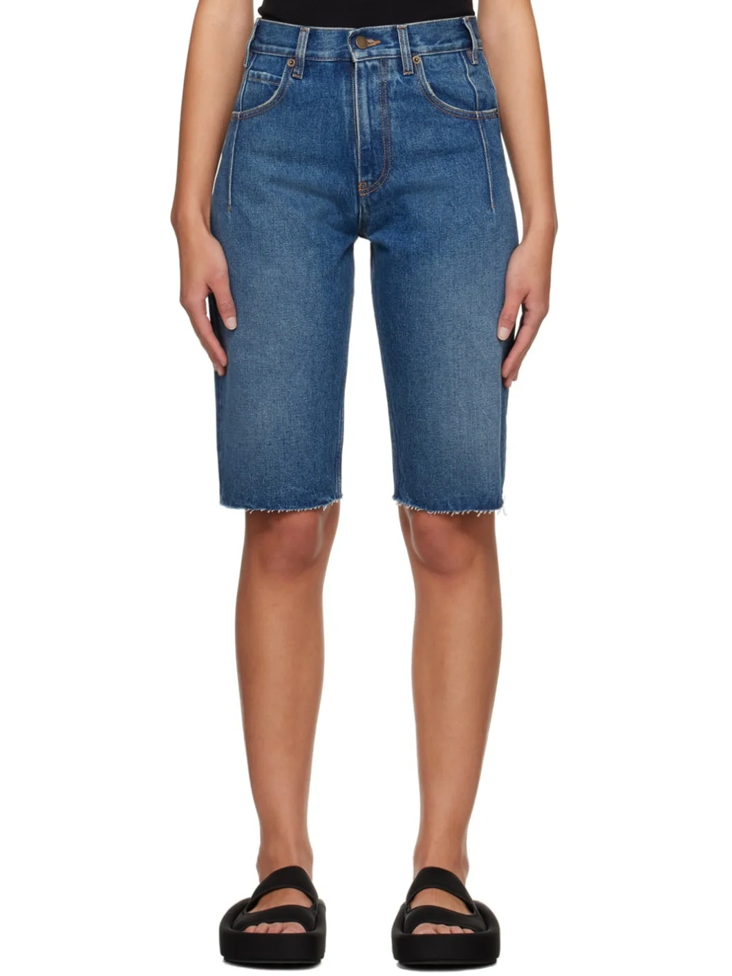 Non-stretch denim shorts. Darts, fading, and subtle distressing throughout. · Belt loops · Five-pocket styling · Zip-fly · Raw edge at cuffs · Logo patch at back waistband · Contrast stitching in tan Supplier color: Medium wash Body: 100% cotton. Lining: 65% polyester, 35% cotton. Made in Italy 241589F088002