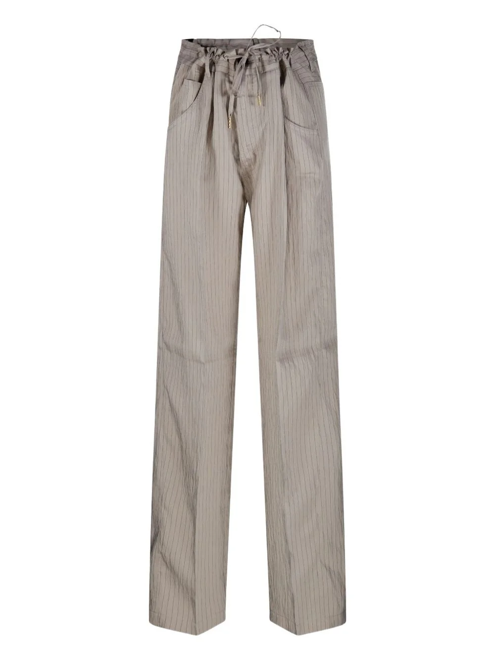 pinstriped trousers Highlights - Taupe - Elasticated drawstring waistband - Two rounded pockets to the sides - Two rear patch pockets - Wide leg Made in Italy Composition Modal 86%, Polyamide 12%, Polyester 2%