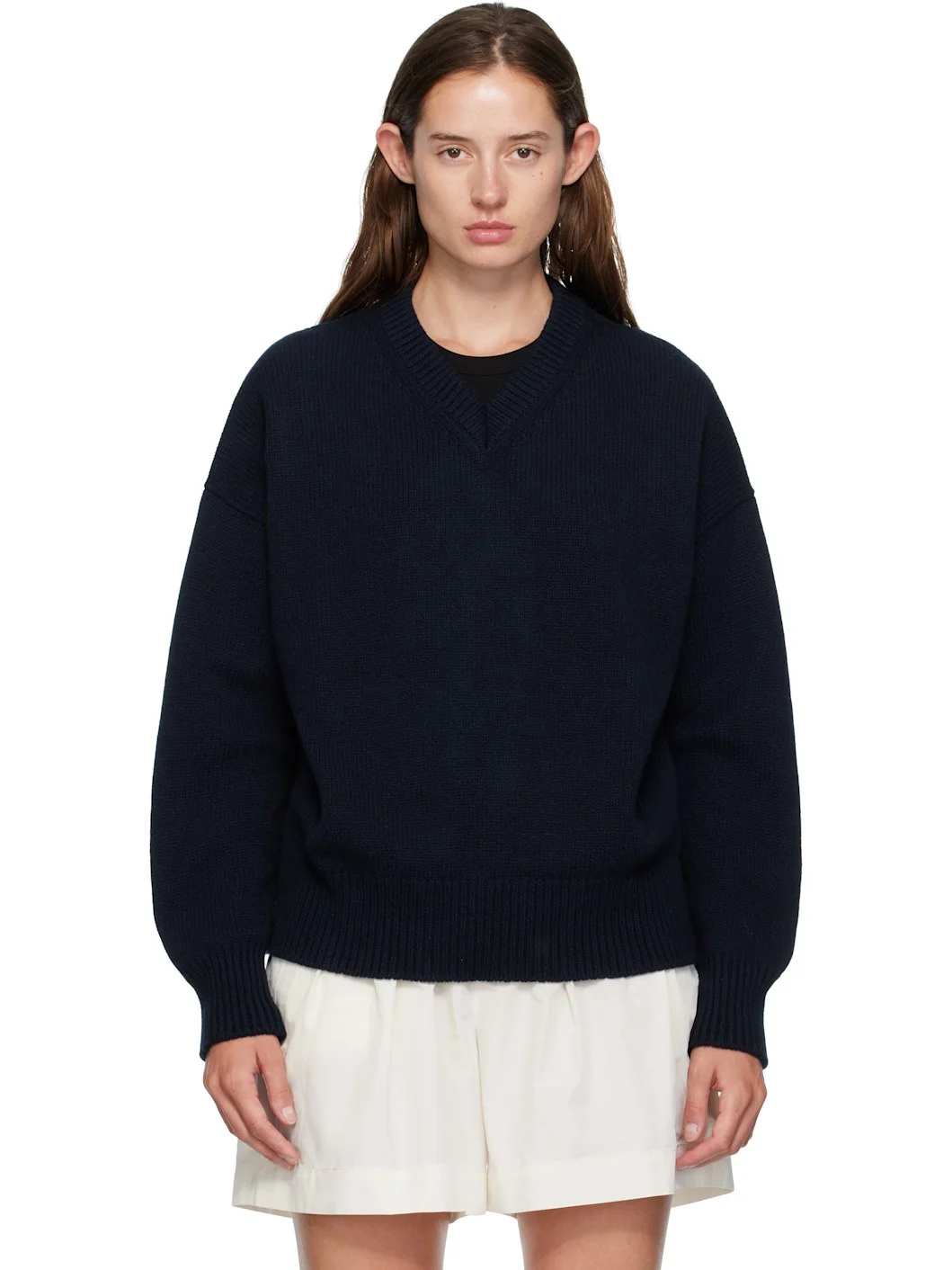 5-gauge knit virgin wool sweater. · RWS-certified virgin wool · Fully fashioned construction · Rib-knit V-neck, hem, and cuffs · Dropped shoulders Supplier color: Navy 100% virgin wool. Made in Ireland 252255F100003