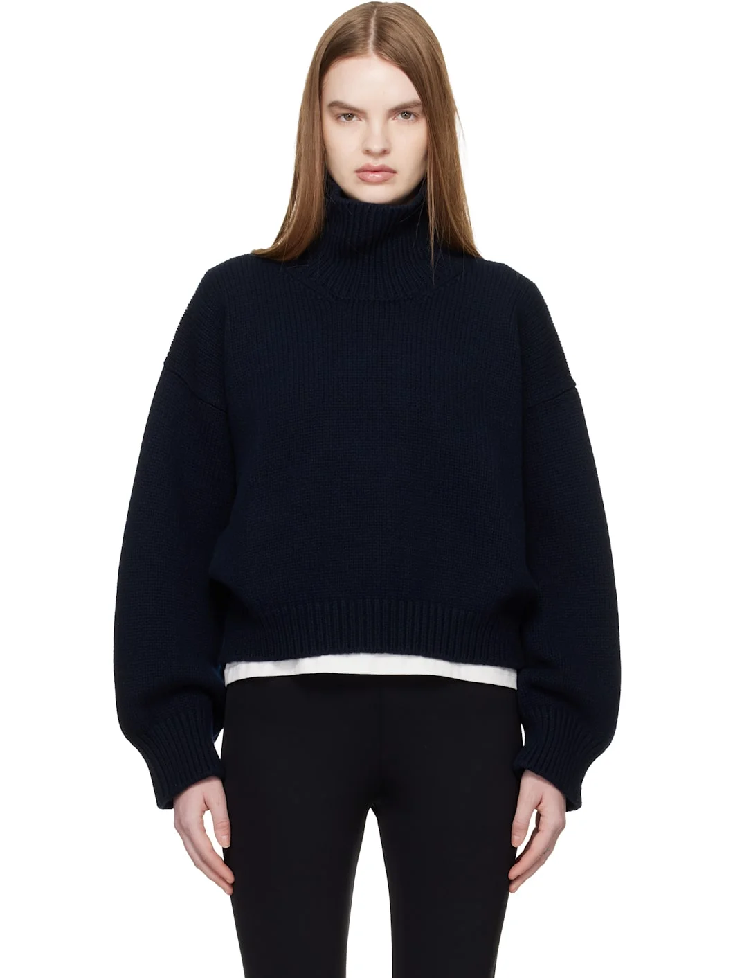 Heavyweight knit lambswool turtleneck. · Fully fashioned construction · Hand-finished · RWS-certified lambswool · Rib-knit collar, hem, and cuffs · Dropped shoulders Supplier color: Navy 100% lambswool. Made in United Kingdom 261255F099000