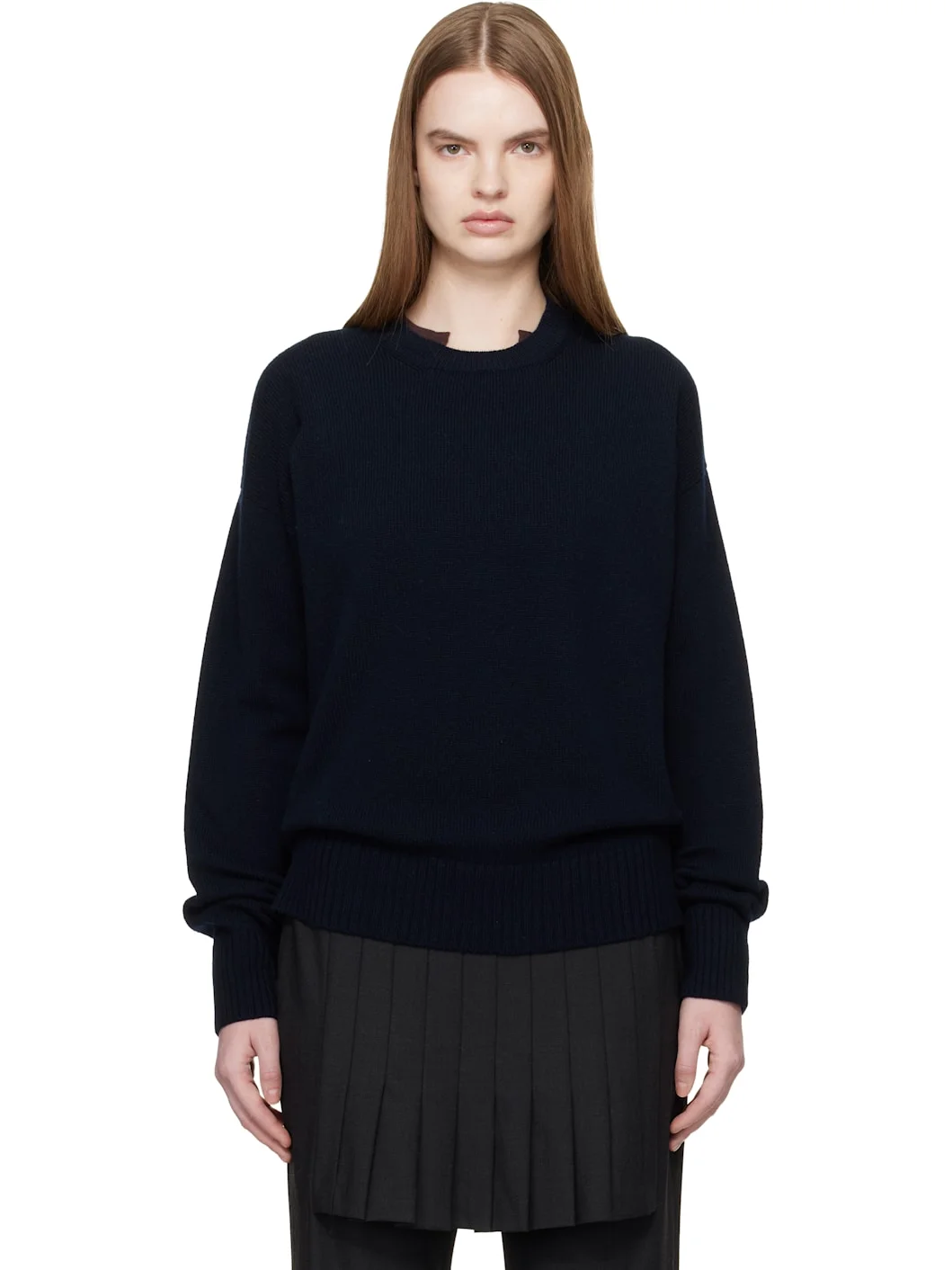 Knit RWS-certified superfine lambswool sweater. · Fully fashioned construction · Hand-finished · Rib-knit crewneck, hem, and cuffs · Dropped shoulders Supplier color: Navy 100% superfine lambswool. Made in United Kingdom 261255F096001