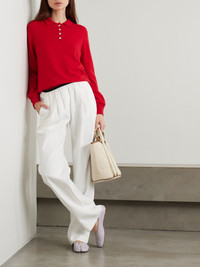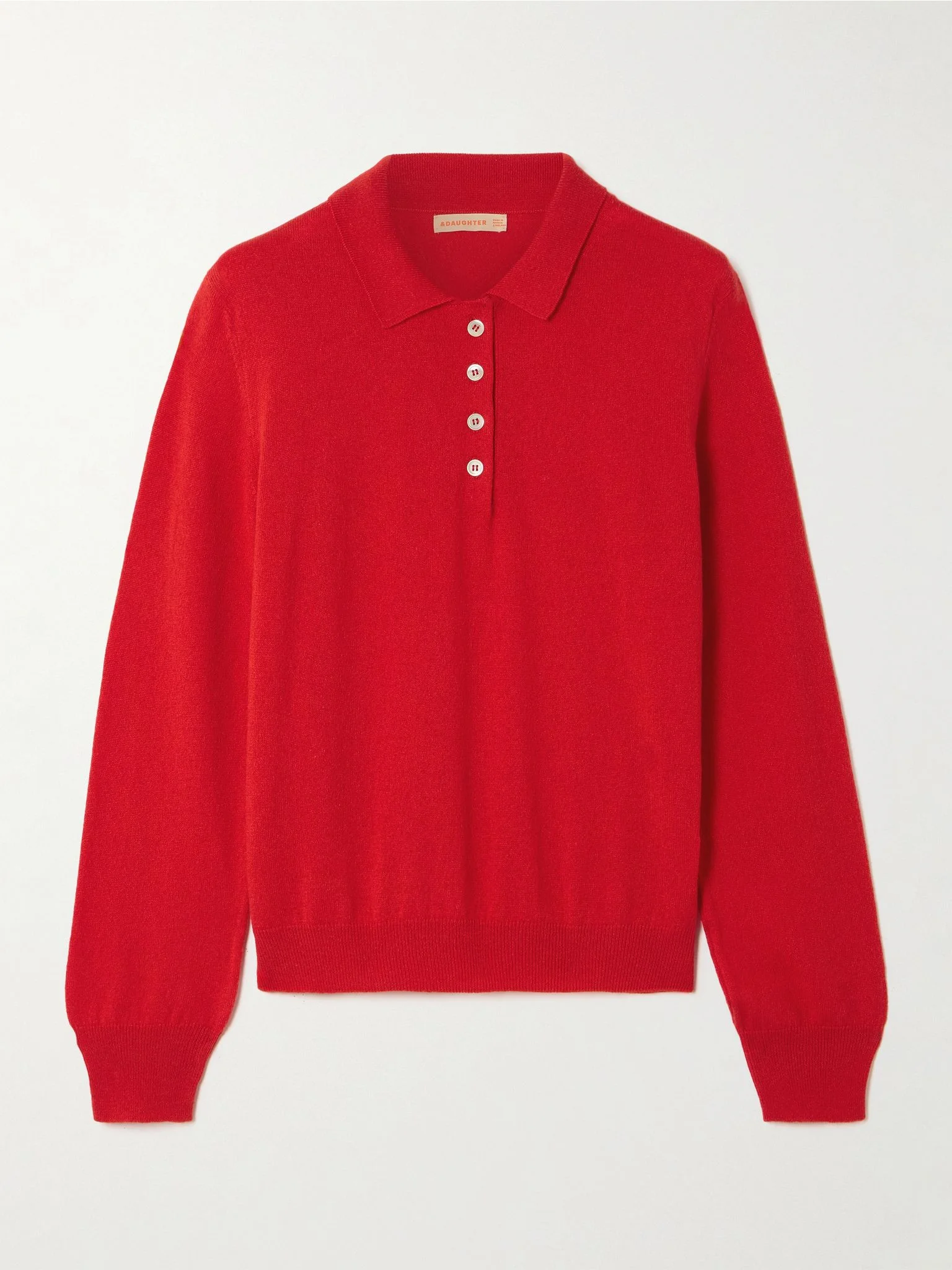 &Daughter's collections celebrate local fabrics and craftsmanship. Embracing both, this 'Aoife' polo sweater is knitted from soft yarns, which are spun from cashmere and cotton in Loch Leven. The slightly loose shape has been linked and finished by hand in Scotland. Lower-Impact Materials. This product is made using at least 50% lower-impact materials or ingredients. Responsible Craftsmanship. This product promotes artisanal skills and a brand that invests in communities and adheres to fair-trade principles. Find out more about our NET SUSTAIN criteria here. Size & Fit - Fits true to size, take your normal size - Designed for a slightly loose fit - Lightweight knit - Model is wearing a size Small Details & Care - Red cashmere and cotton-blend - Slips on - 64% cashmere, 36% cotton - Hand wash or dry clean - Designer color: Poppy Red - Shell: Japan
