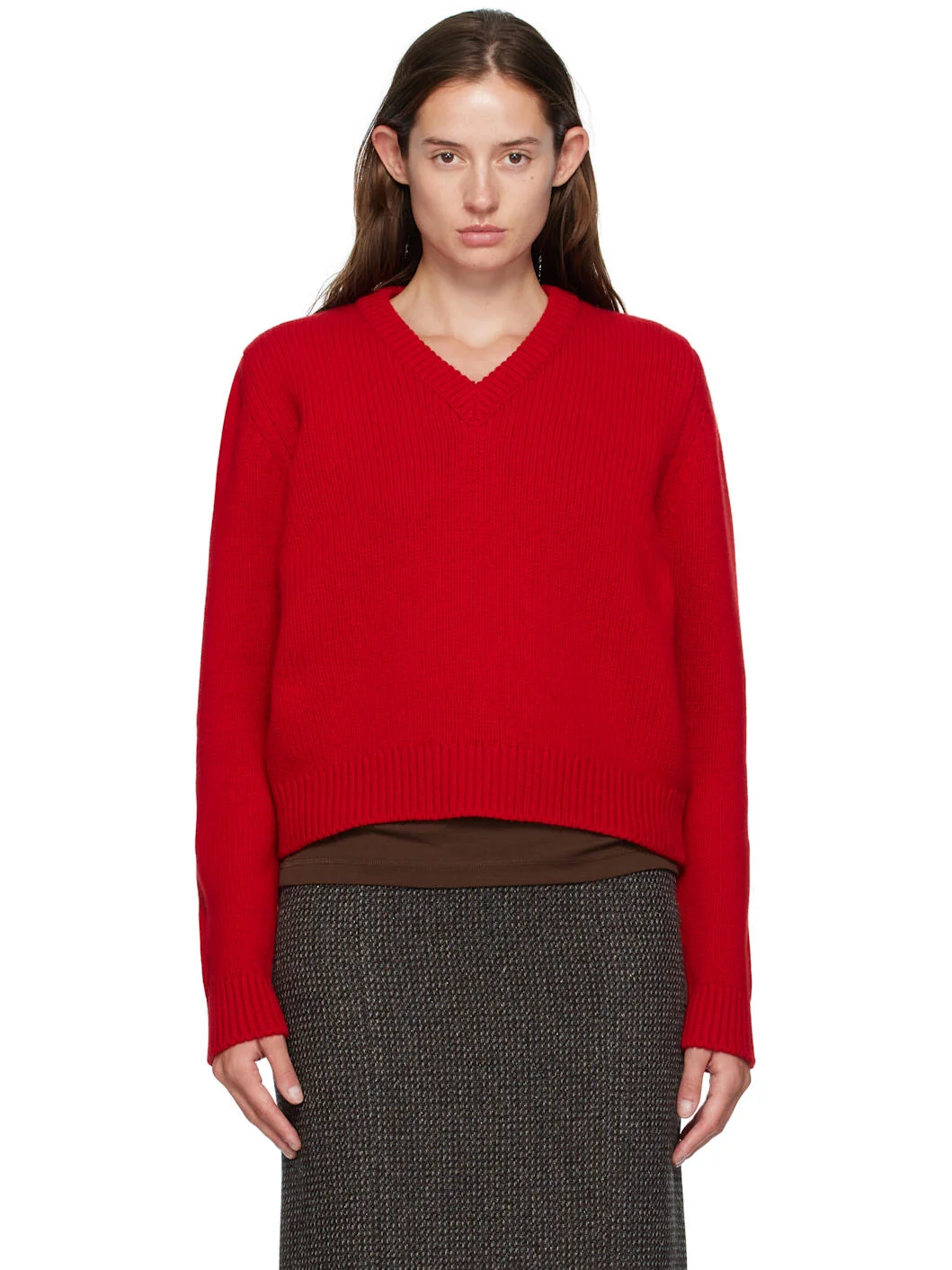 Handcrafted knit Geelong lambswool sweater. Rib-knit V-neck, hem, and cuffs. Supplier color: Ruby red 100% lambswool. Made in United Kingdom 252255F096006