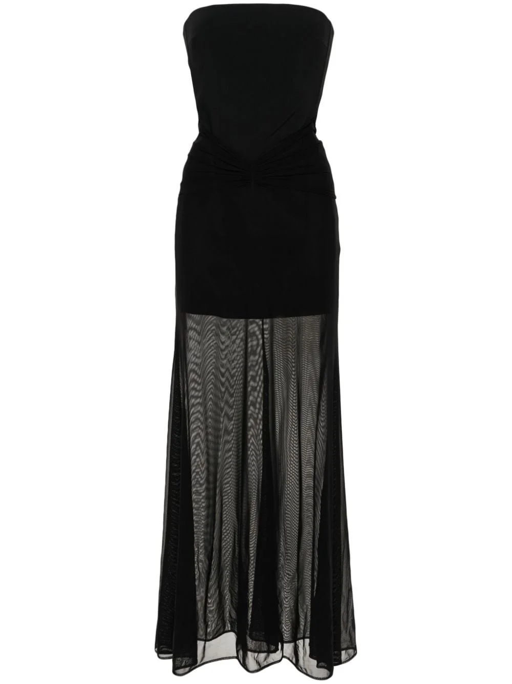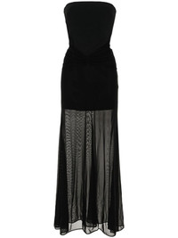 panelled strapless gown Highlights - Black - Crepe texture - Semi-sheer panels - Strapless - Fitted waistline - Gathered detailing - Tulle overlay - Maxi skirt - Concealed rear zip fastening Made in United Kingdom Composition Outer: Acetate 52%, Viscose 45%, Spandex/Elastane 3% Lining: Viscose 64%, Polyester 36% SIZE & FIT Model measurements Height 5 ft 10 in(1.78 m) Bust/Chest 32.67 in(83 cm) Hips 35.43 in(90 cm) Waist 23.22 in(59 cm) FittingInformation Designed for a close fit throughout Made from a midweight fabric This piece fits true to size – take your usual size Washing instructions Dry Clean Only