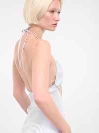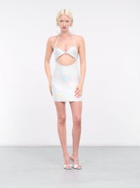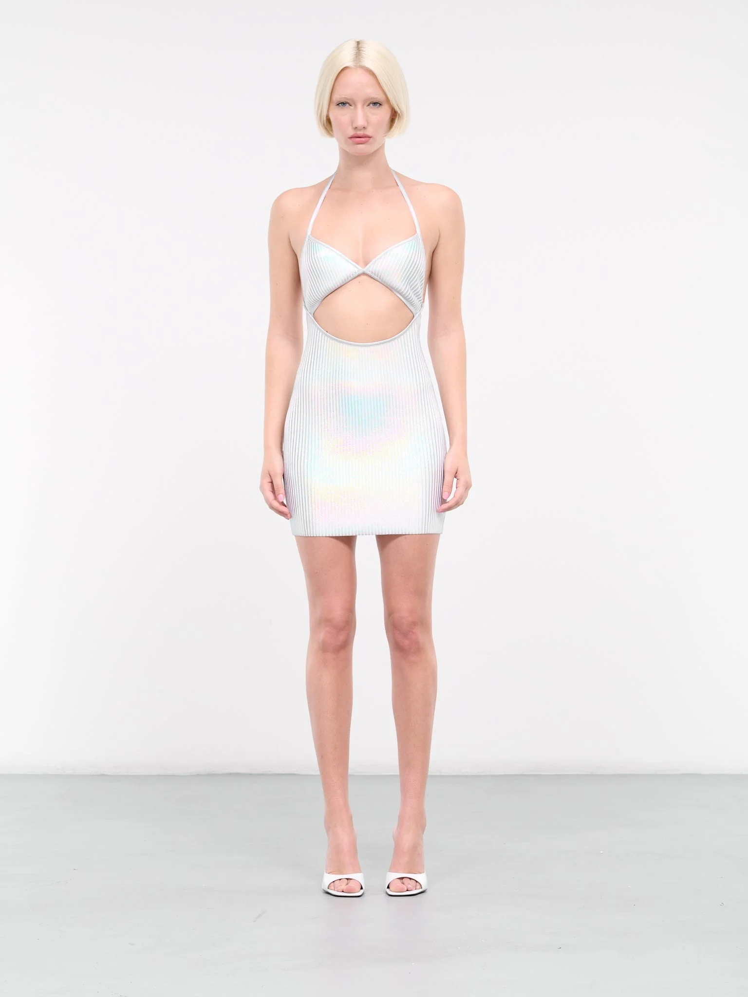 DAVID KOMA dress in silver, paneled rib-knit construction, iridescent finish, halterneck, back self-tie fastening, sweetheart neckline, open back, front cut-out, back concealed zip closure, straight hem, mini-length, form fit. Imported Outer: 100% Lamb Leather Inner: 64% Viscose 36% Polyester Standard Sizing Model is 5'9" wearing size XS. Bust: 32" Waist: 24" Hips: 34"