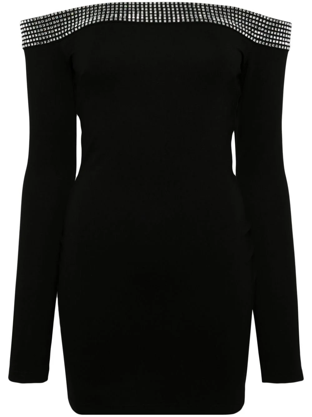crystal-embellished off-shoulder dress Highlights - Black - Stretch-jersey - Crystal embellishment - Off-shoulder - Concealed rear zip fastening - Long sleeves - Thigh-length - Straight hem Made in United Kingdom Composition Viscose 60%, Polyamide 35%, Elastane 5% SIZE & FIT Model measurements Height 5 ft 9 in(1.76 m) Bust/Chest 31.1 in(79 cm) Hips 35.03 in(89 cm) Waist 24.4 in(62 cm) FittingInformation Designed for a close fit throughout The elasticated shoulders offer movement and a comfortable fit Made from a midweight stretch fabric, this piece offers elasticity and flexibility when worn This piece fits true to size – take your usual size Washing instructions Dry Clean Only