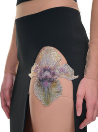 DAVID KOMA skirt in black, dual construction, net mesh insert, crystal flower embellishment, high leg cut-out slit, back zip fastening, fitted. UK Sizing Model is 5'11" wearing size 8. Bust: 32” Waist: 24” Hip: 35"