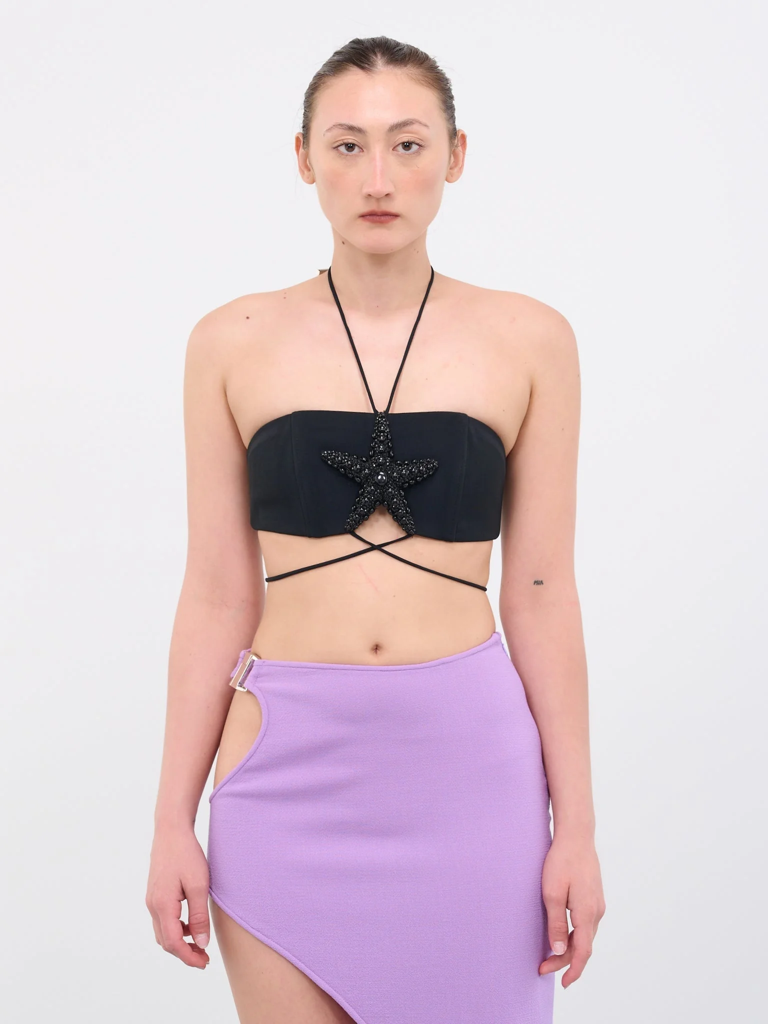 DAVID KOMA top in black, bra design, stretch cady, crystal hand-embroidered starfish detail, back zip closure, neck & back spaghetti cross-cross self-tie straps, lined, fitted. Made in UK UK Sizing Body - 52% Acetate, 45% Viscose, 3% Elastane Lining - 64% Viscose, 36% Polyester Detail - 50% Glass, 50% Acrylic Model is 5'8" wearing size 8. Bust: 32" Waist: 26" Hip: 32"