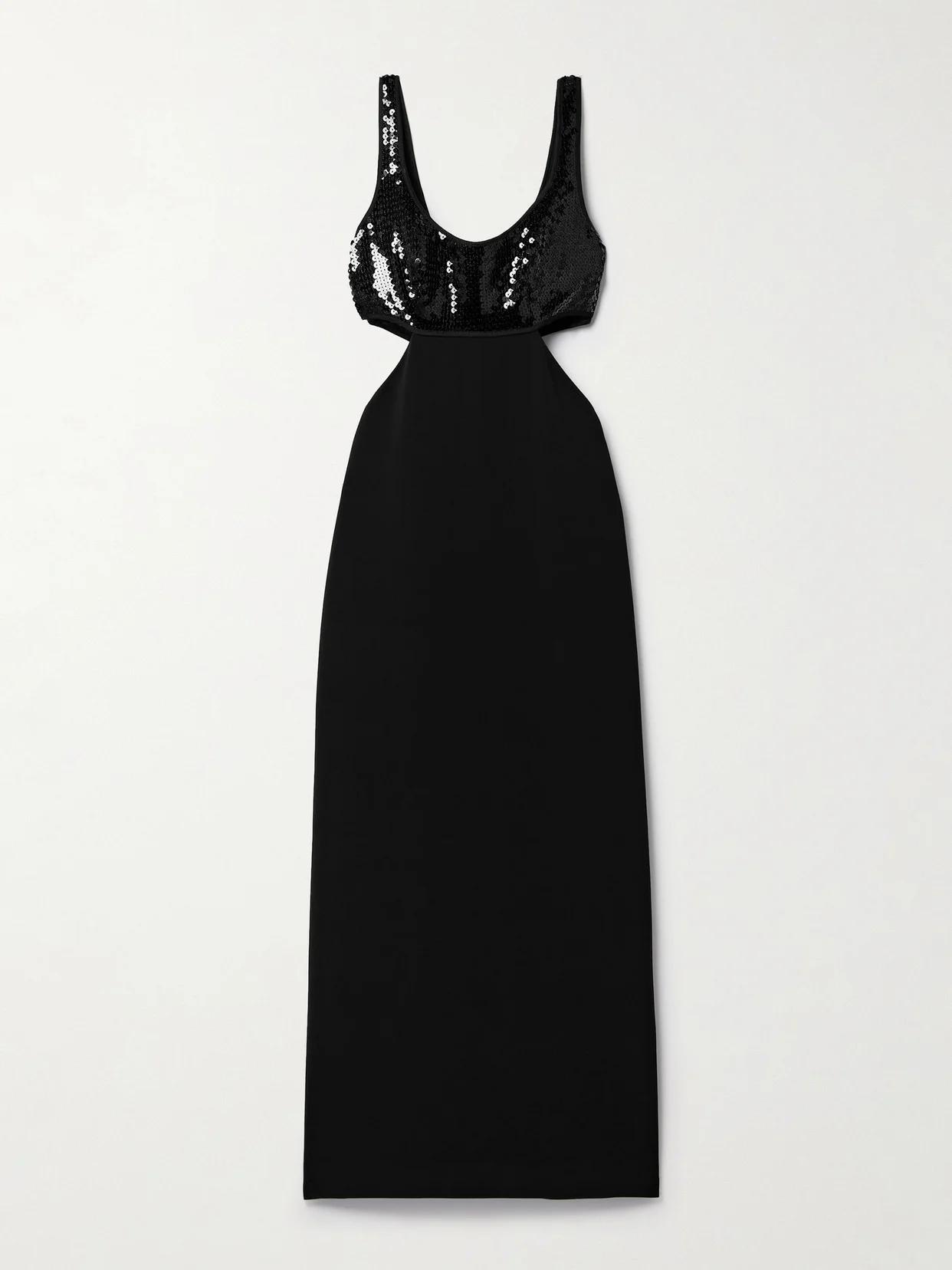 David Koma's Spring '24 collection is filled with glamorous designs fit for a party, just like this midi dress. Made from black cady, it has a sparkling sequined bust with skin-baring cutouts just above the hips. It's fully lined in satin and has a generous back vent, so you can move comfortably.
