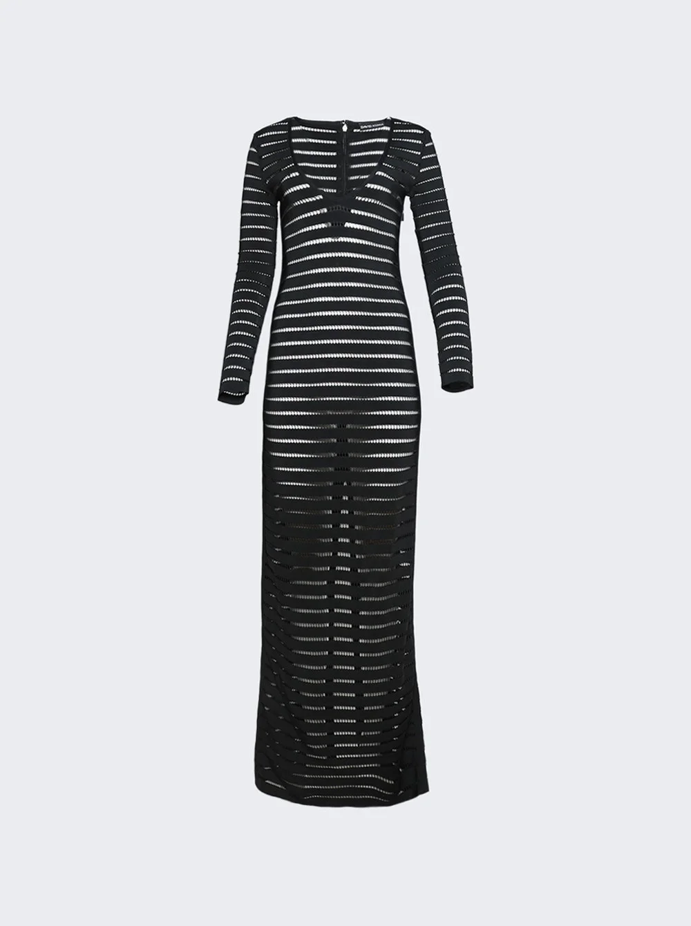 Details - Maxi length - V-neck - Long sleeves - Rear zip closure - Striped cutout knit - Care according to label - Material: 75% Rayon, 23% Nylon, 2% Elastane Vendor Color Code: Brand Style: RE26DKKN19DL Designer/Brand: DAVID KOMA