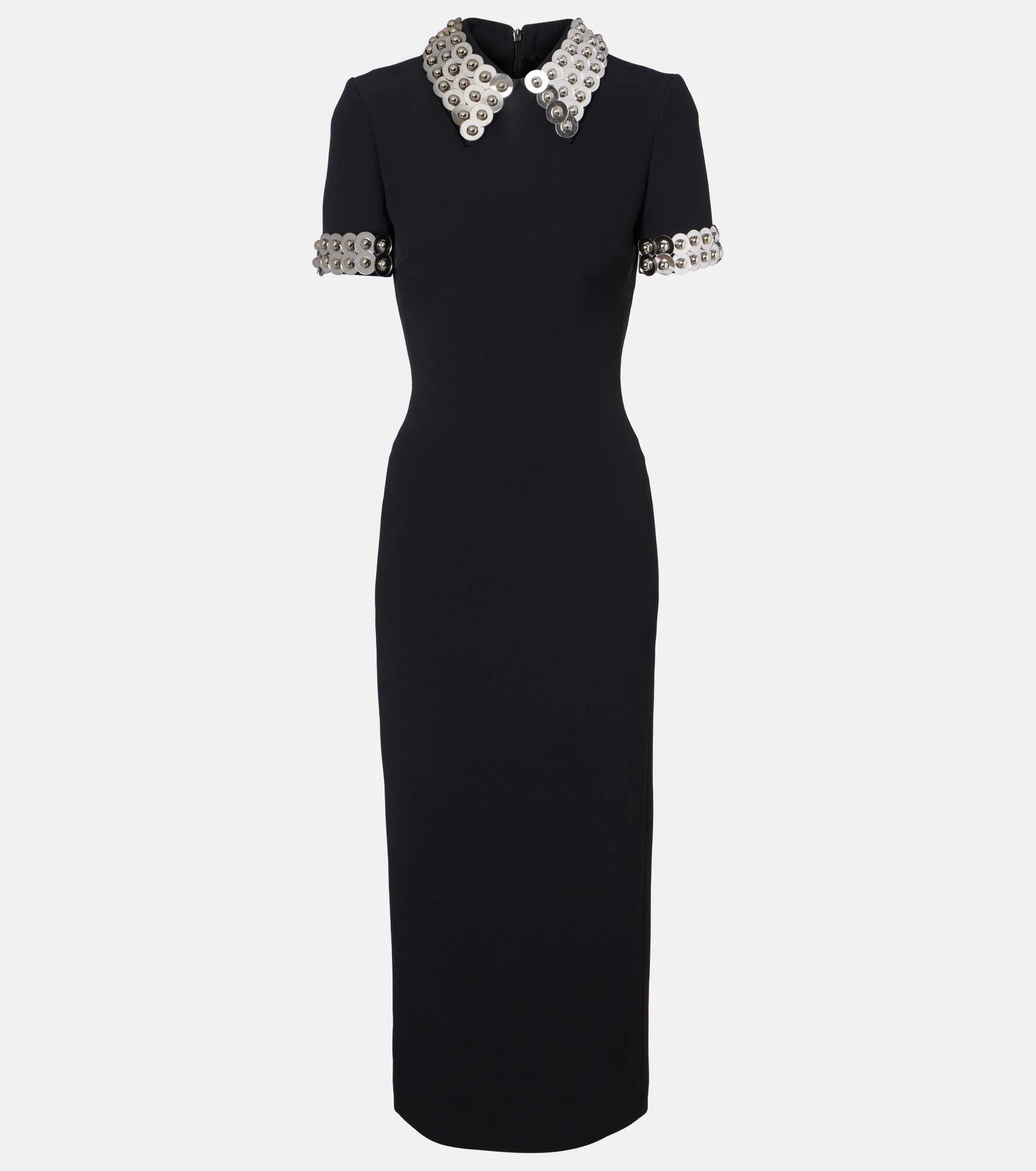 David Koma's glamorous styles are the key to making an entrance when it matters the most. Crafted in stretch cady, this short sleeved midi dress features a classic collar and cuffs embroidered with light-catching embellishments. Product Details - Material: 50% viscose, 47% acetate, 3% elastane - Care instructions: dry clean - Made in the UK - Designer color name: Black/Silver - Item color: black - Lining: 64% viscose, 36% polyester - Closure: invisible zipper - Collar: classic (Straight point) - Long vent - Item number: P01080206 Size & Fit - True to size - Cinched waist - Non-stretchy fabric - The model seen in the picture is 178cm-5'10" and wearing a size UK 8