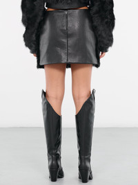 DAVID KOMA black skirt, Nappa leather & faux-fur, mid-waist, tonal back zip closure, mini length, slim fit. Made in Turkey Body - 100% Goat Leather, Faux-Fur Lining - 100% Viscose UK Sizing Model is 5'8" wearing size 8. Bust: 32" Waist: 24" Hips: 34