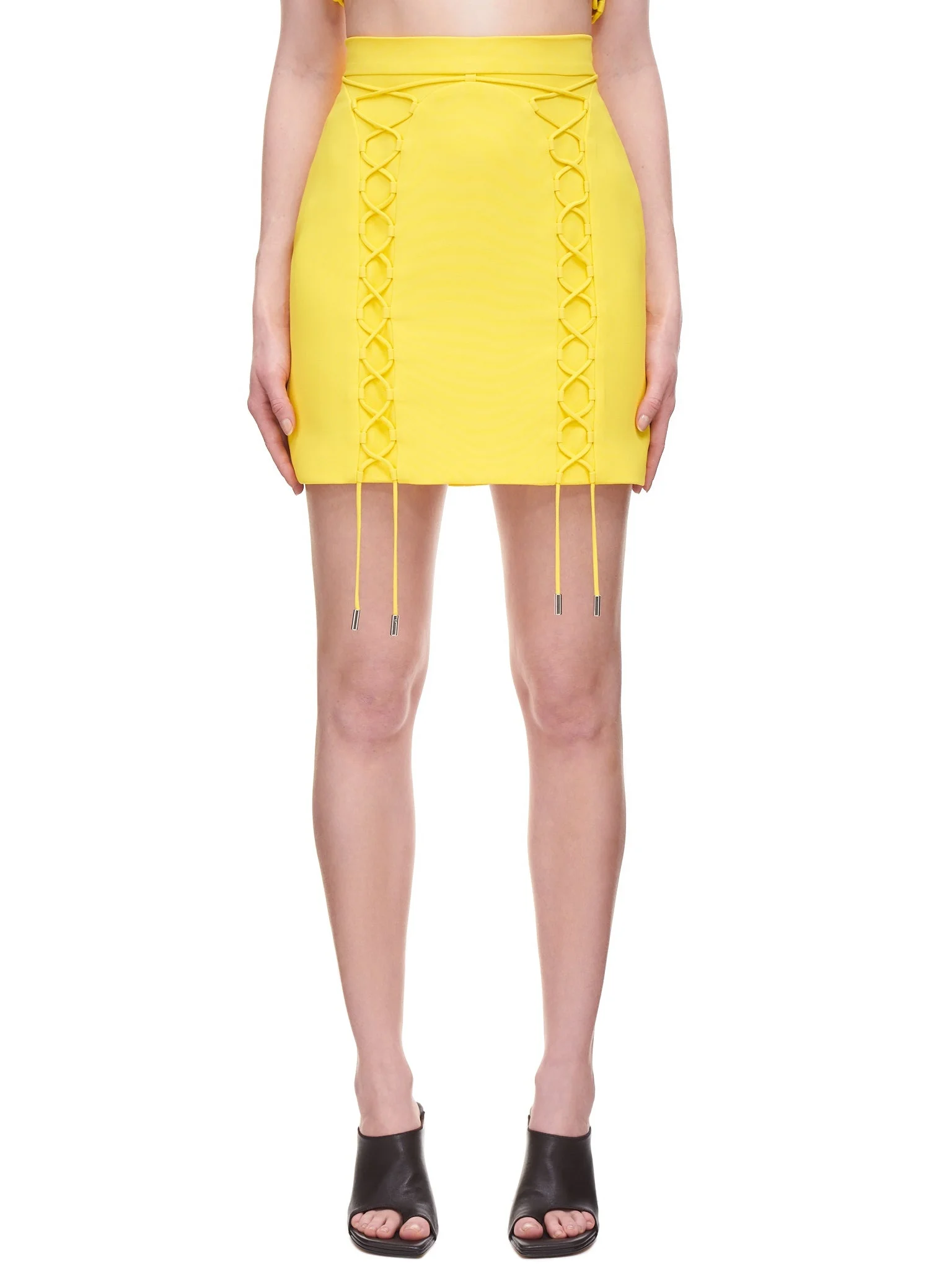 David Koma skirt in yellow, high waisted, front lacing panel construction, tonal back zip closure, lined. Made in The United Kingdom. U.K. Sizing. Composition: (Main): 52% Acetate, 45% Viscose, 3% Elastane, (Lining) 64% Viscose, 36% Poly-blend. Model Measurements: Model is 5ft 8” and wearing a size 8. Bust: 31” Waist: 25” Hip: 37"