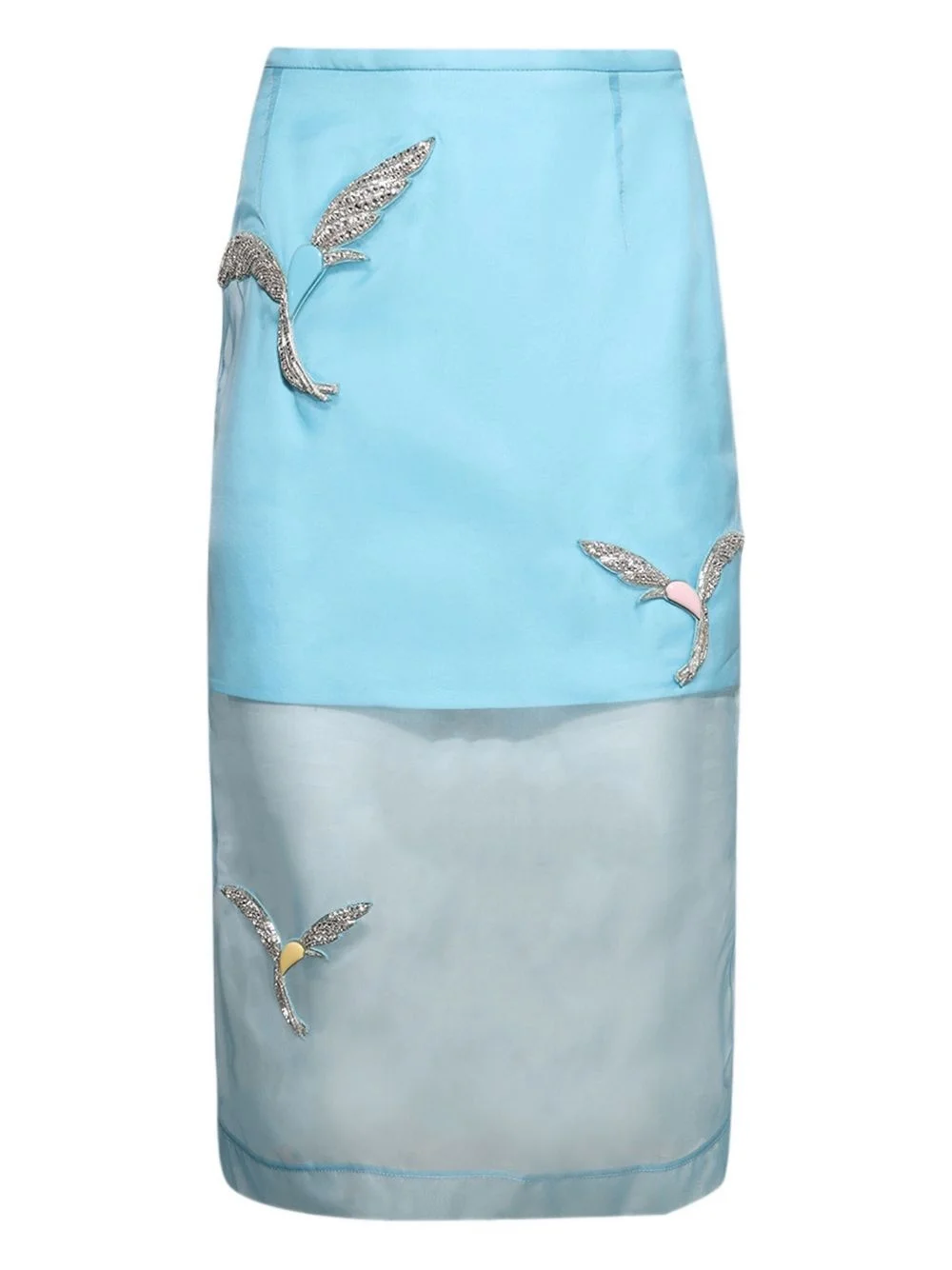 hummingbird embellished organza skirt Highlights - Light blue - Organza fabric - Hummingbird embellishment - Sheer panel - Mid length Imported Composition Silk 100% Washing instructions Read Manufacturer Guidelines