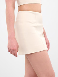 DAVID KOMA skirt in ivory, stretch cady, side cut-out, iridescent PVC trim, mid-waist, back zip closure, mini length, lined, fitted. Made in UK UK Sizing Body - 52% Acetate, 45% Viscose, 3% Elastane Lining - 68% Acetate, 32% Polyester Trim - 100% PVC Model is 5'8" wearing size 8. Bust: 32" Waist: 26" Hip: 32"