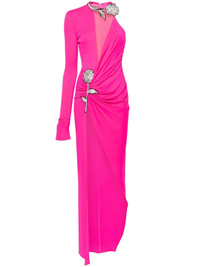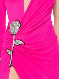 floral-applique ruched gown Highlights - Fuchsia pink - Stretch-jersey - Tulle panels - Ruched detailing - Floral applique - Glass crystal embellishment - Asymmetric design - V-neck - Concealed rear zip fastening - Single long sleeve - Side slit - Straight hem - Floor-length - Unlined Made in United Kingdom Composition Polyester 95%, Polyacrylic 50%, glass 50%, Elastane 5% SIZE & FIT Model measurements Height 5 ft 11 in(1.8 m) Bust/Chest 33.07 in(84 cm) Hips 37.4 in(95 cm) Waist 25.19 in(64 cm) FittingInformation Designed for a slim fit that sits just away from the body offering a close yet comfortable fit Made from a midweight stretch fabric, this piece offers elasticity and flexibility when worn This piece fits true to size – take your usual size