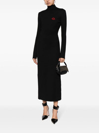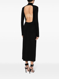 open-back jersey midi dress Highlights - Black/blood red - Jersey texture - Embroidered motif - High neck - Open back - Long sleeves - Straight hem - Mid-calf length Made in United Kingdom Composition Viscose 60%, Polyamide 35%, Elastane 5% SIZE & FIT Model measurements Height 5 ft 10 in(1.77 m) Bust/Chest 31.49 in(80 cm) Hips 35.43 in(90 cm) Waist 25.19 in(64 cm) FittingInformation Designed for a slim fit that sits just away from the body offering a close yet comfortable fit Made from a midweight stretch fabric, this piece offers elasticity and flexibility when worn This piece fits true to size – take your usual size Washing instructions Dry Clean Only