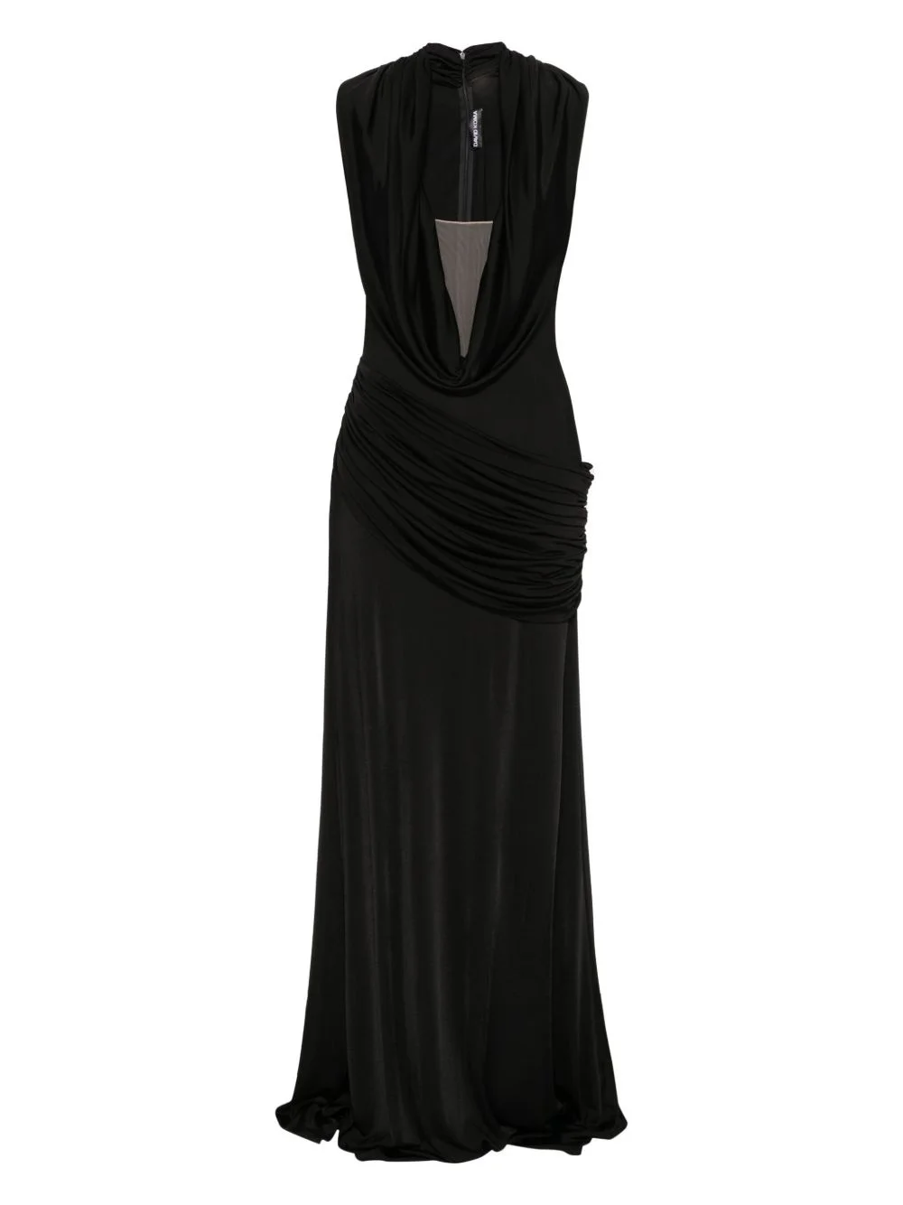 plunge-neck sleeveless maxi dress Highlights - Black - Concealed rear zip fastening - Ruched detailing - Draped detailing Imported Composition Acetate 95%, Elastane 5% SIZE & FIT Model measurements Height 5 ft 11 in(1.8 m) Bust/Chest 32.67 in(83 cm) Hips 35.82 in(91 cm) Waist 25.98 in(66 cm) FittingInformation Designed for a close fit throughout Made from a midweight fabric
