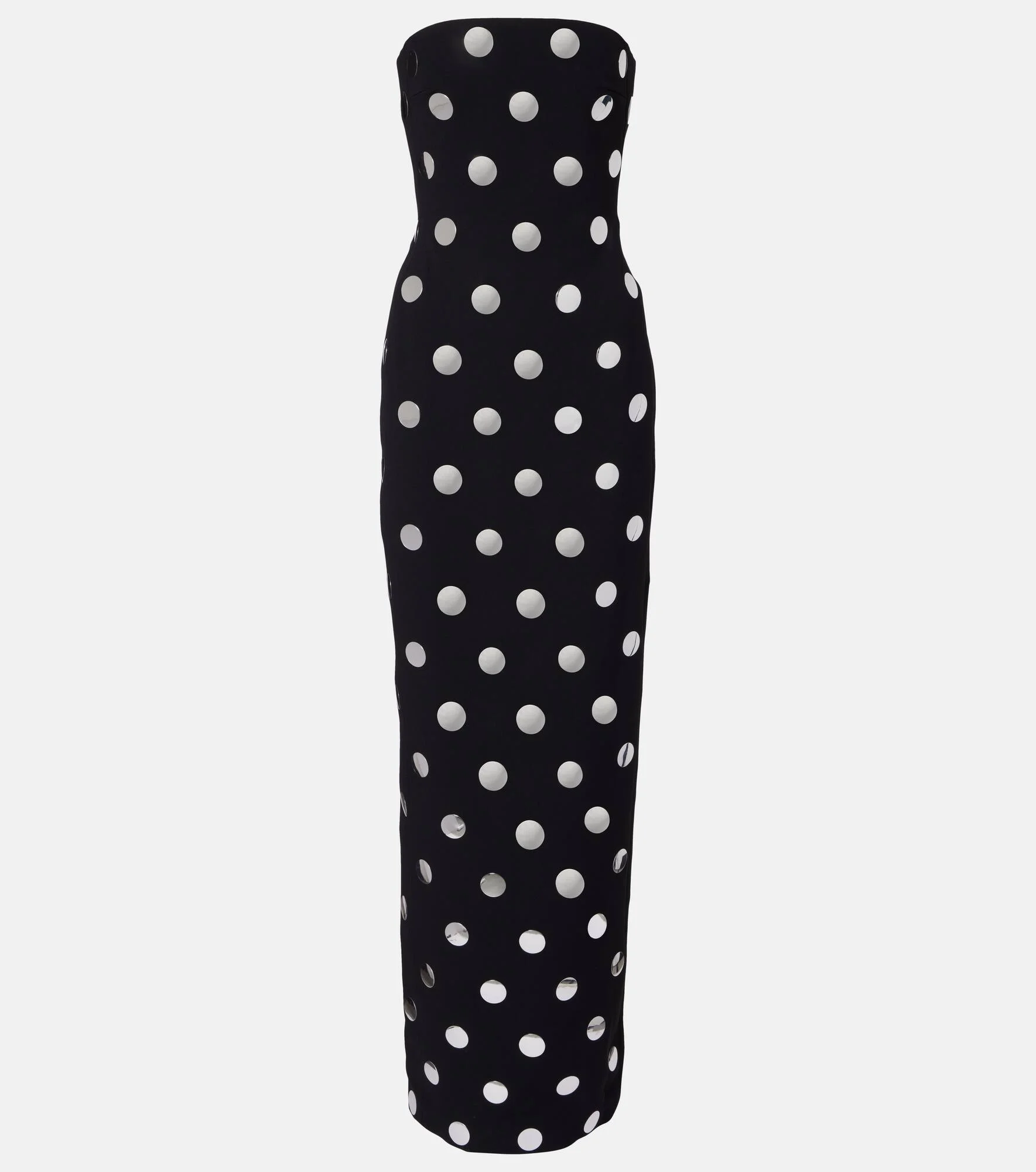 David Koma's glamorous styles are the key to making an entrance when it matters the most. This gown features a strapless silhouette and showcases all-over silver-toned polka dots for a dazzling touch. Product Details - Material: 50% viscose, 47% acetate, 3% elastane - Care instructions: dry clean - Made in the UK - Designer color name: Black/Silver - Item color: black - Lining: 64% viscose, 36% polyester - Insert: 100% aluminum - Long vent - Closure: concealed zipped back - Boning - Item number: P01080170 Size & Fit - True to size - Ideal fit for larger bust sizes - Strapless - Fitted - Non-stretchy fabric - slit length 78cm-30.5" - The model seen in the picture is 178cm-5'10" and wearing a size UK 8