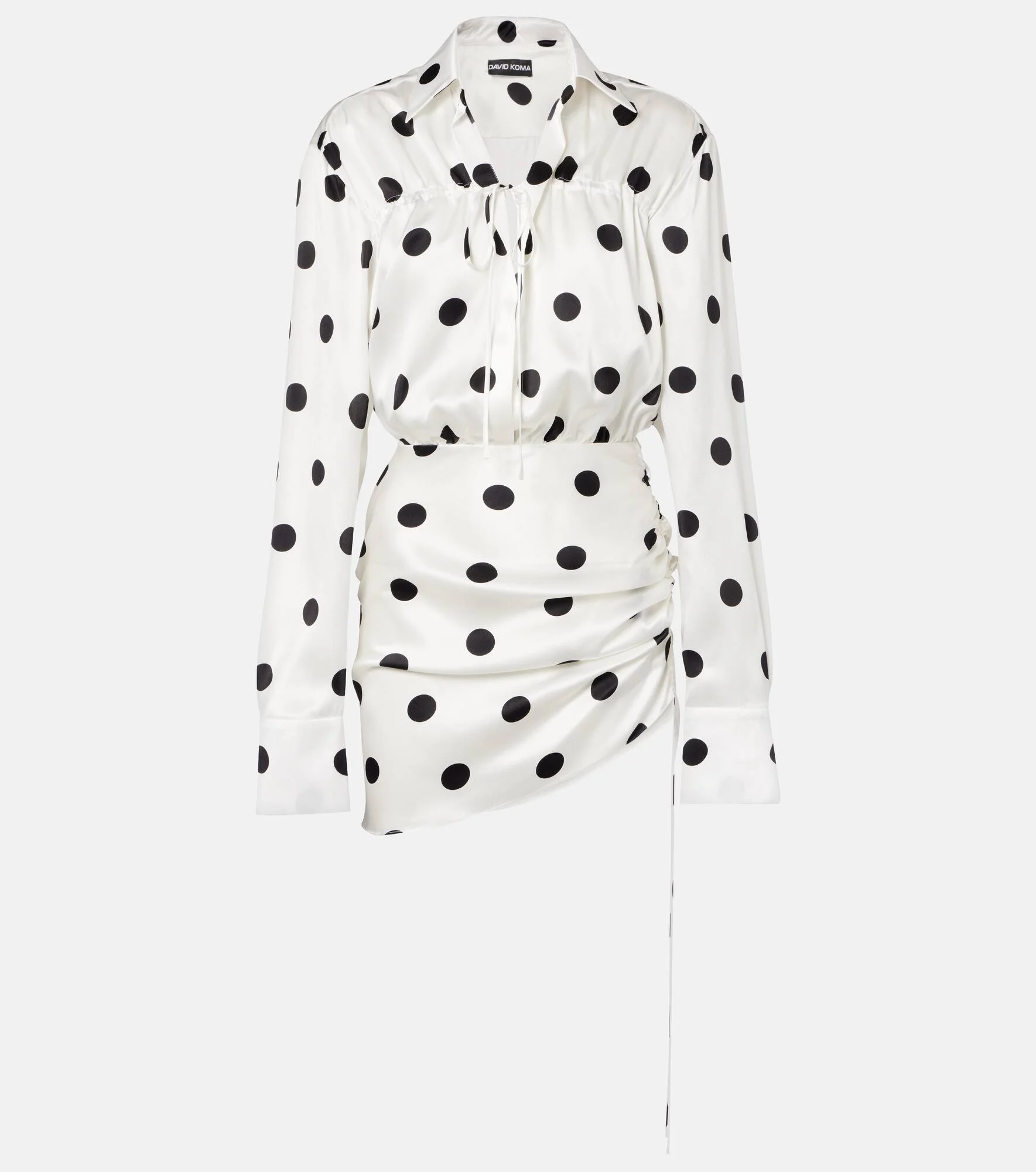 David Koma's glamorous styles are the key to making an entrance when it matters the most. Made from silk satin, this minidress is characterized by its all-over polka-dot print and subtle self-tie at the neckline. Product Details - Material: 100% silk - Care instructions: dry clean - Made in the UK - Designer color name: White/Black - Item color: white, black - Lining: 100% silk - Collar: classic (Straight point) - Closure: zipped side, self-ties - Cuff: buttoned - Item number: P01080174 Size & Fit - True to size - Loose bodice, fitted skirt - Non-stretchy fabric - The model seen in the picture is 178cm-5'10" and wearing a size UK 8