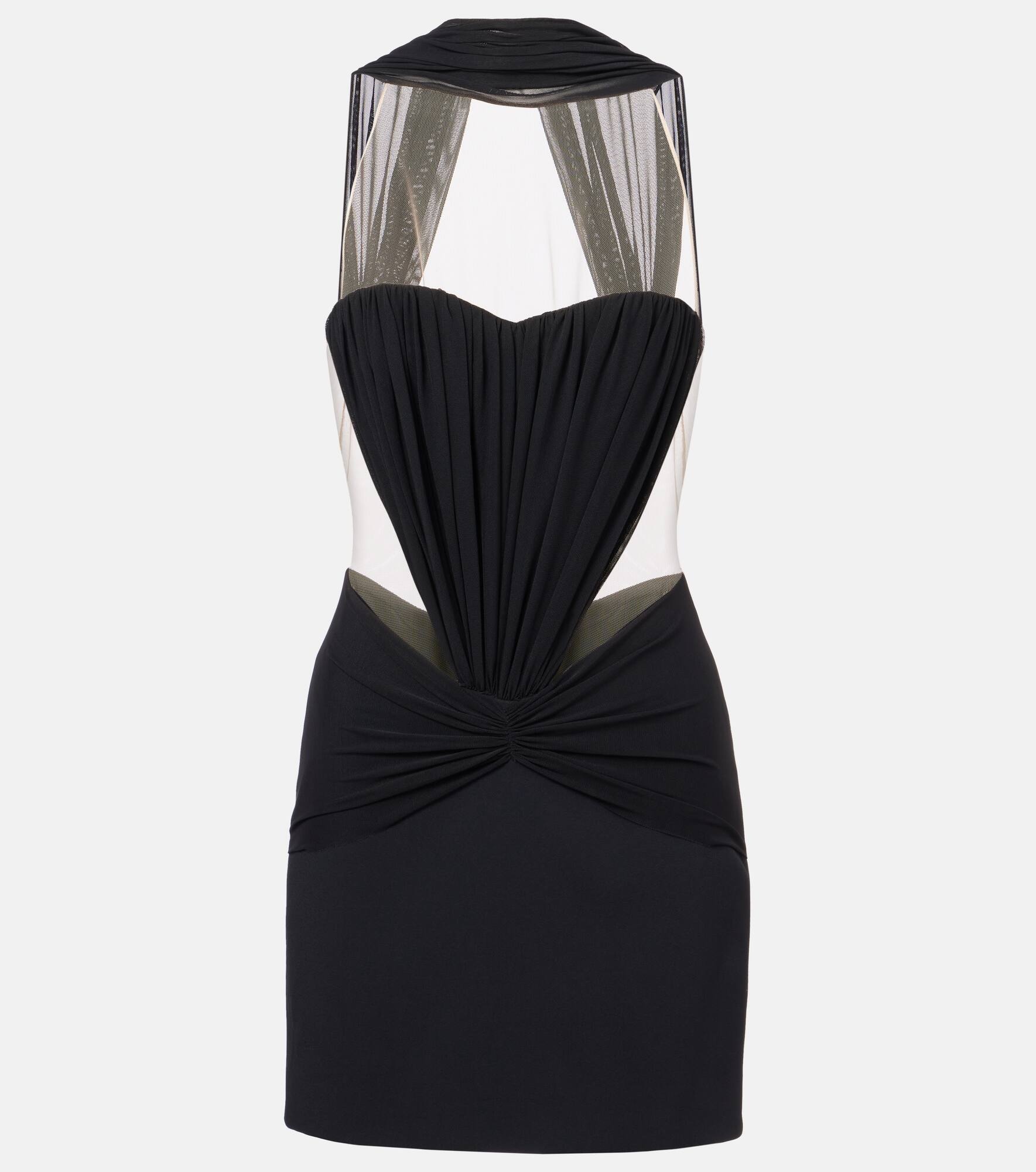 David Koma delivers a bold, body-contouring design with this one-of-a-kind minidress. Made from cady and tulle, this style features a ruched bodice, a gathered skirt, and a scarf detail at the neckline. Product Details - Material: 50% viscose, 47% acetate, 3% elastane - Care instructions: specialist clean - Made in the UK - Designer color name: Black - Item color: black - Closure: concealed zipper - Material II: 92% polyamide, 8% elastane - Lining: 64% viscose, 36% polyester - Item number: P01026258 Size & Fit - True to size - Internal boned corset for support - Fitted - Non-stretchy fabric - The model seen in the picture is 178cm-5'10" and wearing a size UK 8