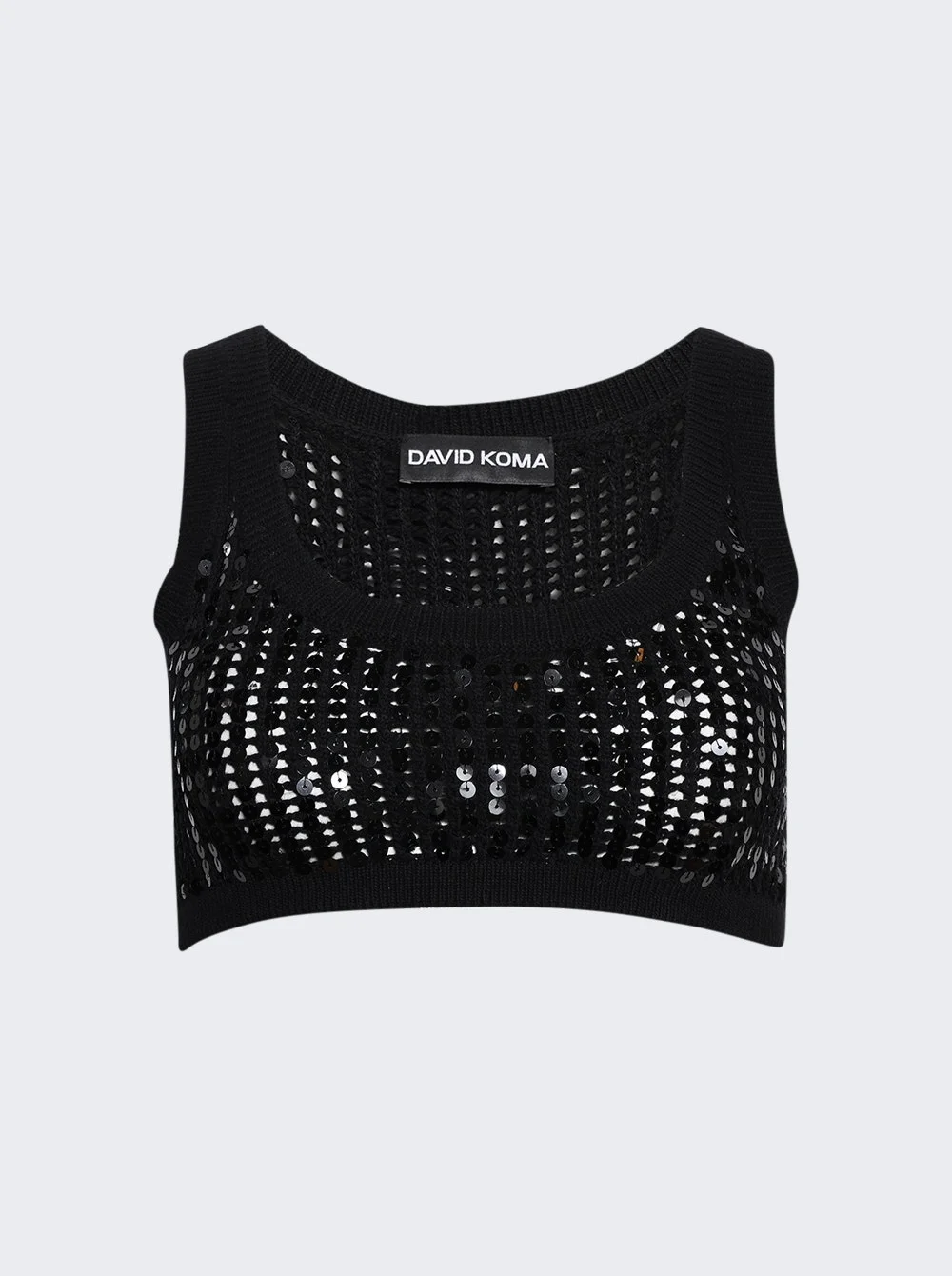 Details - Fitted silhouette - Cropped silhouette - Sequin embellishment - Sleeveless - Knitted construction - Care according to label - Material: 90% polyester, 10% polyamide - Model is 5'9"/175cm and is wearing a size S Brand Style: RE25DKKN08T Designer/Brand: DAVID KOMA