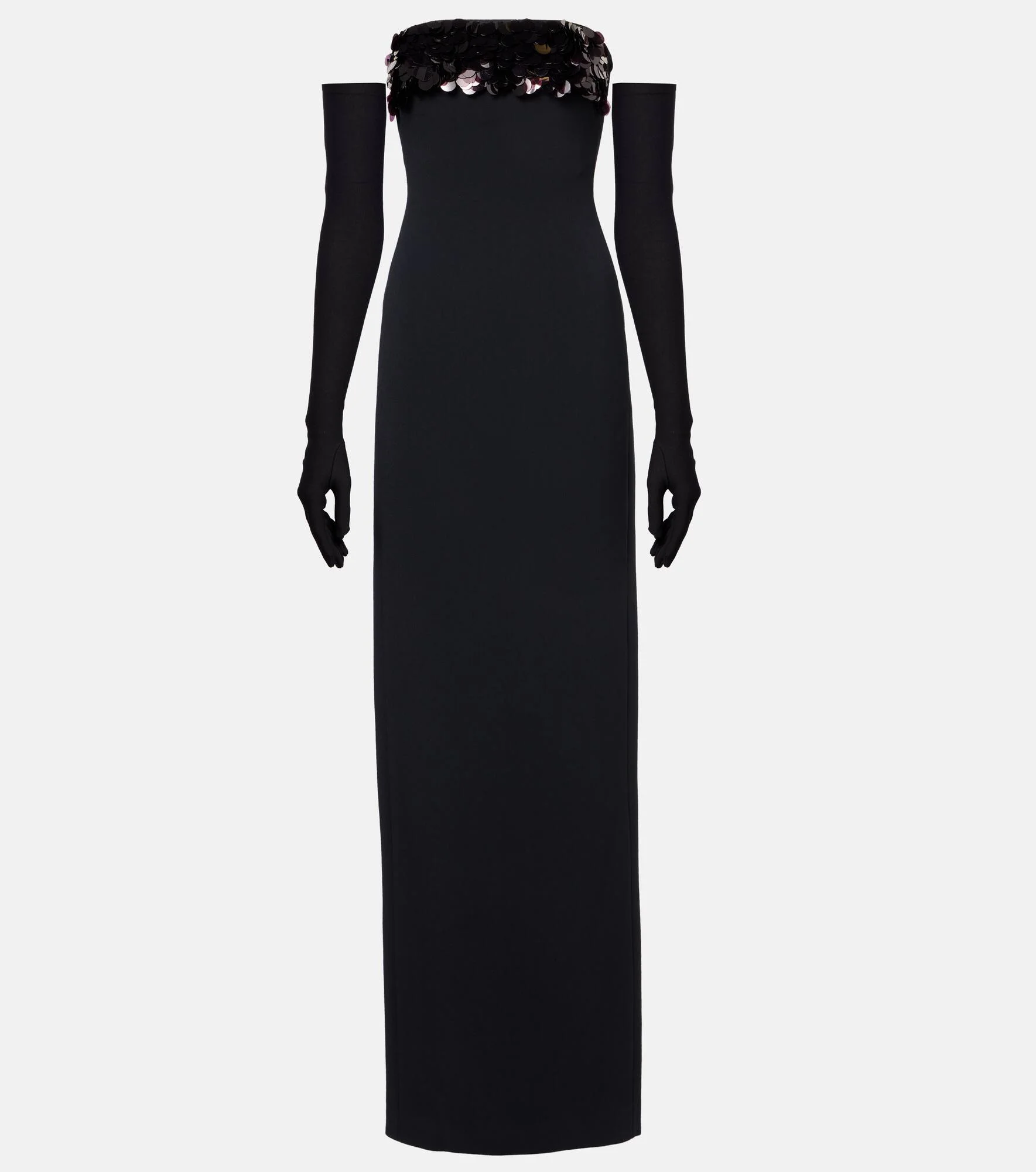 David Koma's glamorous styles are the key to making an entrance when it matters the most. This strapless gown features sequin embellishments at the neckline, internal boning, a center-back slit, and detachable gloves for a refined touch. Product Details - Material: 50% viscose, 47% acetate, 3% elastane - Care instructions: dry clean - Made in the UK - Designer color name: Black/Burgundy - Item color: black, burgundy - Lining: 64% viscose, 36% polyester - Embroidery: 50% vinyl, 50% glass - Closure: zipped back - Boning - Long vent - Fully lined - Detachable gloves - Item number: P01051697 Size & Fit - True to size - Strapless - Fitted - Non-stretchy fabric - slit length 78cm-30.5" - The model seen in the picture is 178cm-5'10" and wearing a size UK 8