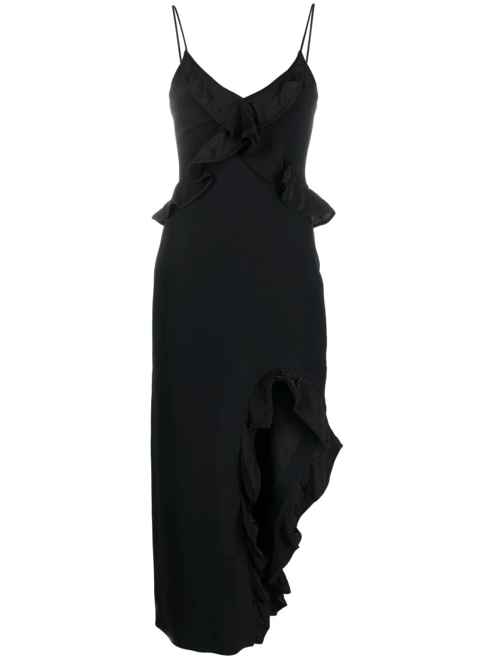 spaghetti-strap ruffle-detail dress Highlights - Black - V-neck - Spaghetti straps - Ruffled detailing - Rear zip fastening - Side slit - Mid-length - Asymmetric hem Made in United Kingdom Composition Outer: Acetate 52%, Viscose 45%, Spandex/Elastane 3% Lining: Acetate 96%, Lyocell 4% SIZE & FIT Model measurements Height 5 ft 11 in(1.8 m) Bust/Chest 31.49 in(80 cm) Hips 36.61 in(93 cm) Waist 24.4 in(62 cm) FittingInformation Designed for a slim fit that sits just away from the body offering a close yet comfortable fit Made from a midweight stretch fabric, this piece offers elasticity and flexibility when worn This piece fits true to size – take your usual size