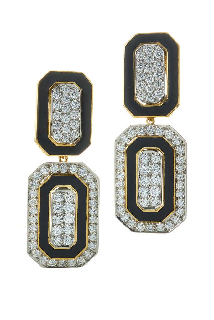 DETAILS AND INSIGHT David Webb diamond black tuxedo earrings in yellow gold. From David Webb'S Manhattan Minimalism Collection 18K Yellow, White Gold, Enamel 8.52Ctw Diamonds Can Be Worn As Drop Or Stud Earrings Style OS70-23573E