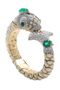 DETAILS AND INSIGHT David Webb diamond emerald couture fish bracelet in yellow gold. From David Webb's Kingdom Collection 18K Yellow Gold, Platinum, Enamel 8.85ctw Diamonds, Emerald 6.13ctw Style NS418-07571B-1XYWEX