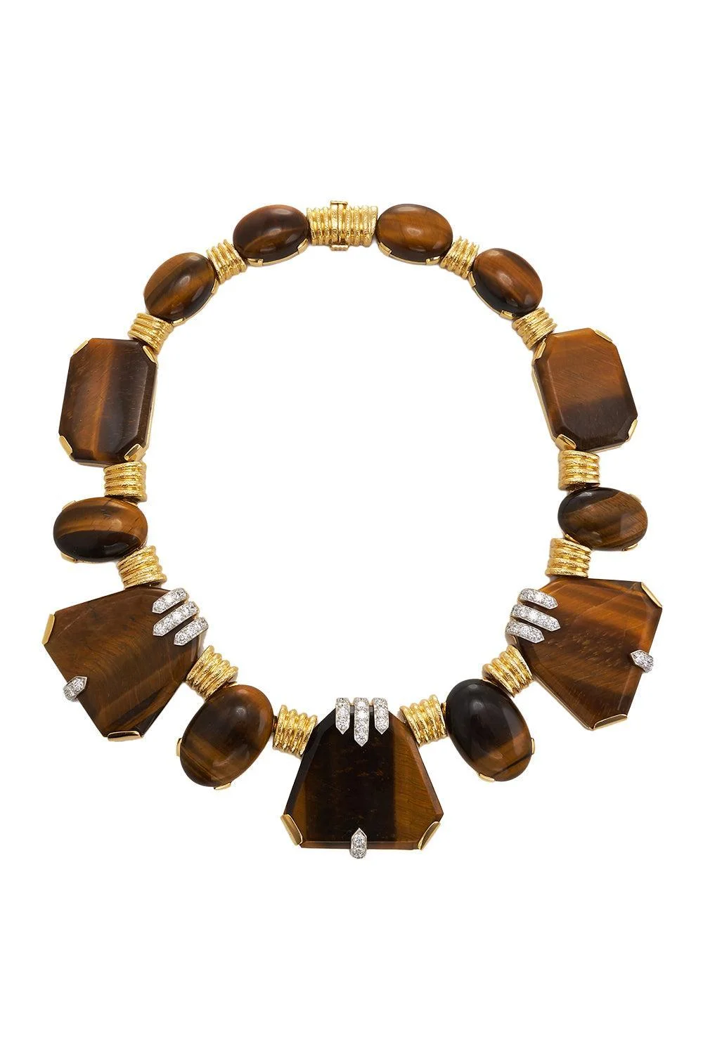 DETAILS AND INSIGHT David Webb diamond tiger eye textured carved necklace in yellow gold. Style PS1-11334N-2