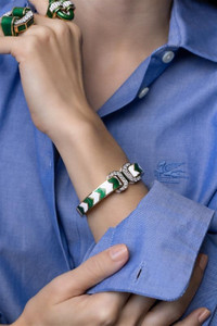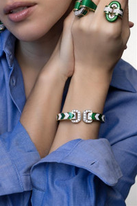 DETAILS AND INSIGHT David Webb green chevron double buckle ring in yellow gold. 18K Yellow Gold, Platinum, Enamel 1.39Ctw Diamonds Style NS492-60616B