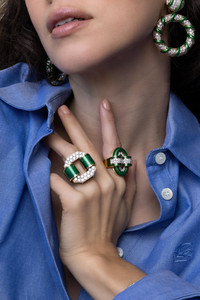 DETAILS AND INSIGHT David Webb green small oval buckle ring in yellow gold. 18K Yellow Gold, Platinum, Enamel 1.55Ctw Diamonds Style NS602-32516R