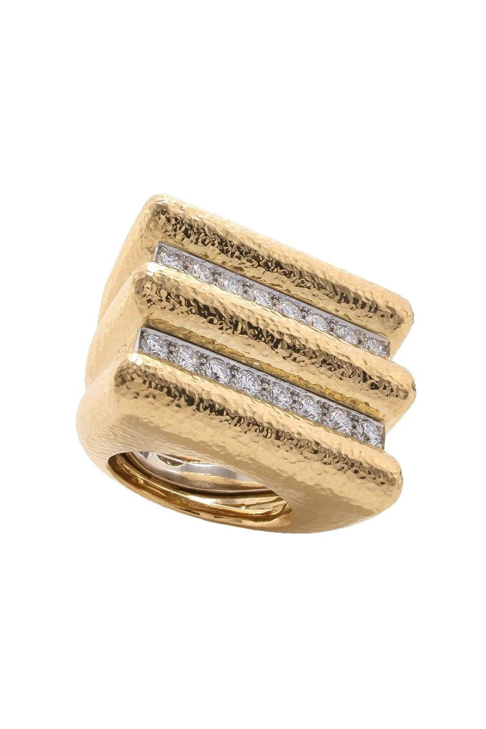 DETAILS AND INSIGHT David Webb hammered radiator ring in yellow gold. 18K Hammered Yellow Gold, Platinum Brilliant-cut diamonds 1.28ctw Style MS570-30728R-2HYXXX