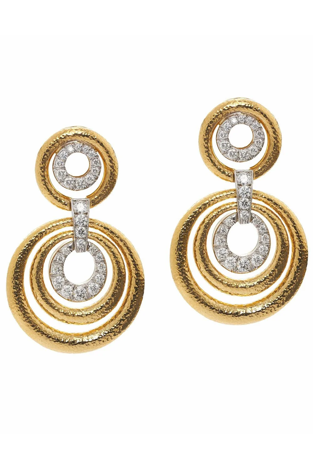 DETAILS AND INSIGHT David Webb diamond triple circle drop earrings in yellow gold. 18K Yellow Gold, Platinum 2.58ctw Diamonds Style NS80-21624E