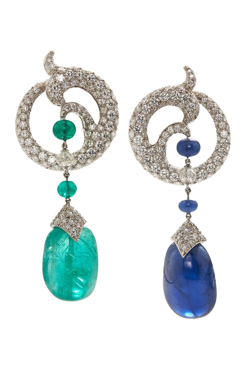 DETAILS AND INSIGHT David Webb sapphire emerald mix match couture earrings in white gold. 18K White Gold, Platinum 12.86Ctw Diamonds, Sapphire, Emerald Style LS38-23688E