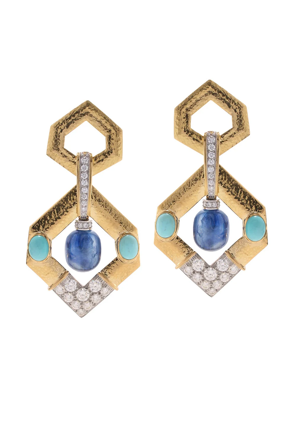 DETAILS AND INSIGHT David Webb sapphire turquoise diamond hexagon doorknocker earrings in yellow gold. 18K Yellow Gold, Platinum Diamonds 3.28Ctw, Sapphire 24.88Ctw, Turquoise 5.07Ctw Style LS42-21599E-1HYXST