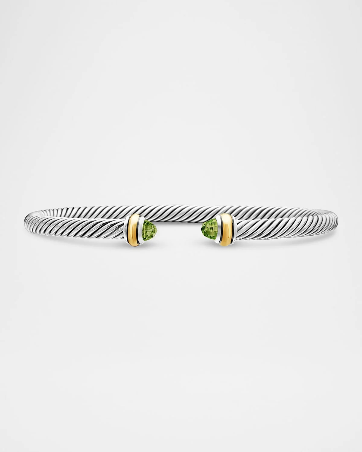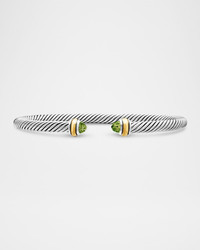 - David Yurman’s artistic signature, Cable began as a bracelet that he hand-twisted from 50 feet of wire. For the past 30 years, he has evolved the twisted helix into a myriad of designs. - David Yurman bracelet from the Cable Collection. - Sterling silver hardware with signature cable motif. - Domed end caps with 18-karat yellow gold trim. - Your choice of multicolor gems at each end. - Amethyst, blue topaz, citrine, prasiolite, black onyx, pearl, or turquoise. - Naturally white freshwater cultured pearls. - Split opening eases dress. - Approx. 4mm wide. - Care Instructions: - Use the provided polishing cloth to gently wipe this item clean, then remove any remaining tarnish with mild diluted soap. Rinse with warm water, dry with a clean towel and store it in its jewelry pouch.
