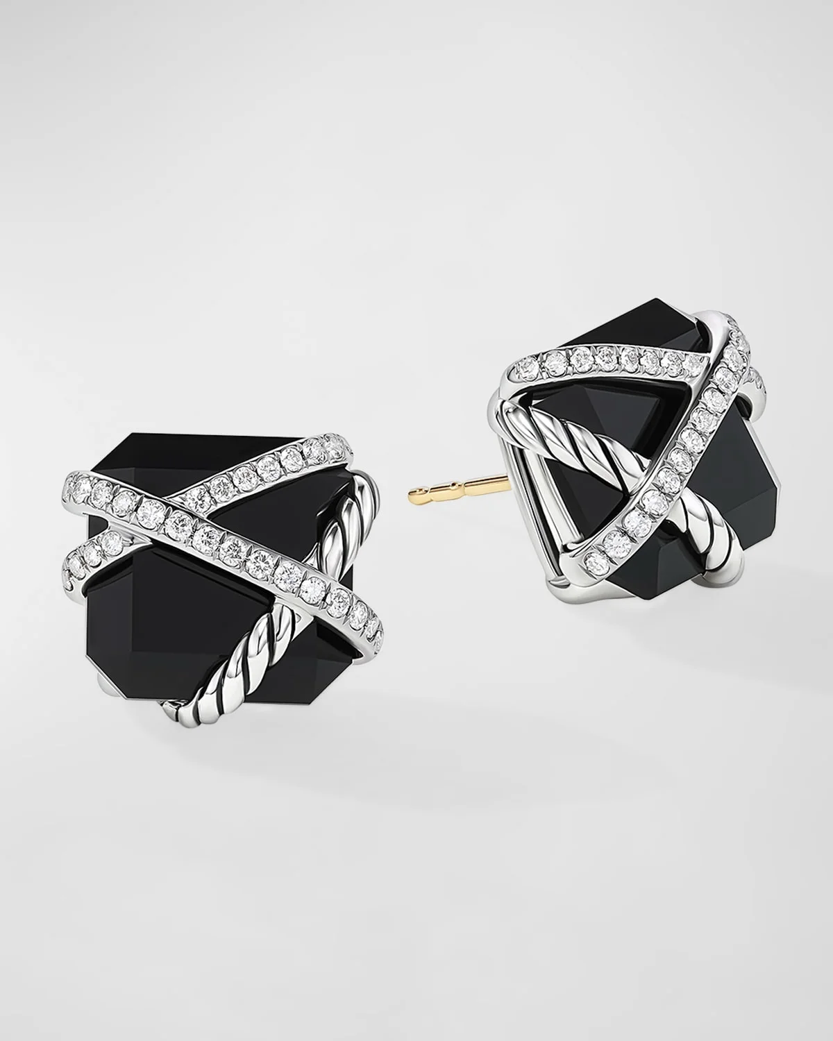 - Sterling silver - Black onyx - Pave-set diamonds, 0.33 total carat weight - Earrings, 12mm wide - For pierced ears - Imported - Care Instructions: - Use the provided polishing cloth to gently wipe this item clean, then remove any remaining tarnish with mild diluted soap. Rinse with warm water, dry with a clean towel and store it in its jewelry pouch.