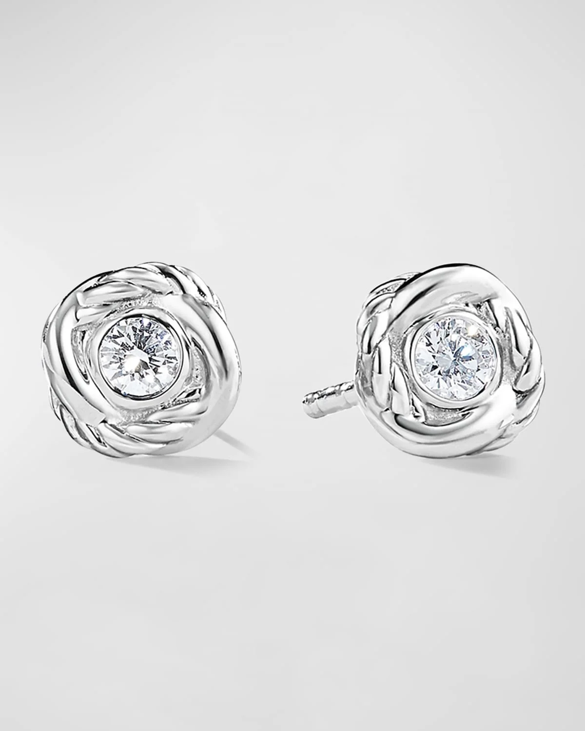 - David Yurman earrings from the Infinity Collection. - 18-karat white gold. - Round white diamonds. - 0.12 total diamond carat weight. - Approx. 0.3" (7mm) diameter. - Post backs for pierced ears.