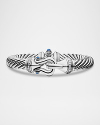 David Yurman cable bracelet with buckle. Polished sterling silver cable and hardware. Buckle closure with diamond pave detailing. Roundcut Hampton blue topaz bezels. 0.45 total diamond carat weight. Approx. 9mm. Imported.
