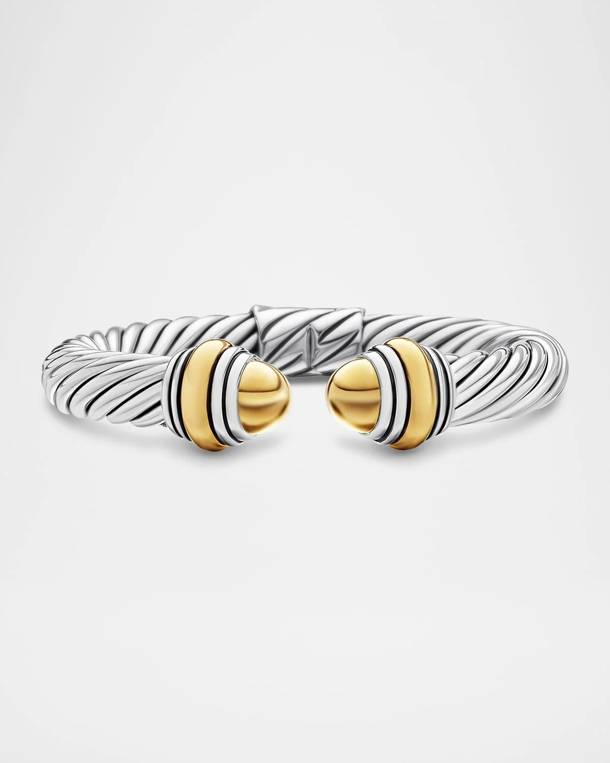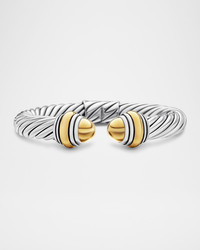 David Yurman bracelet from the Cable Classics Collection. Signature sterling silver with 14karat yellow bonded gold. Your choice of round stone or metal end caps. Citrine, black onyx, bonded gold, or reconstituted turquoise. Approx. 57x44mm diameter; 10mm wide. Split opening eases dress; slipon style. Made in USA.
