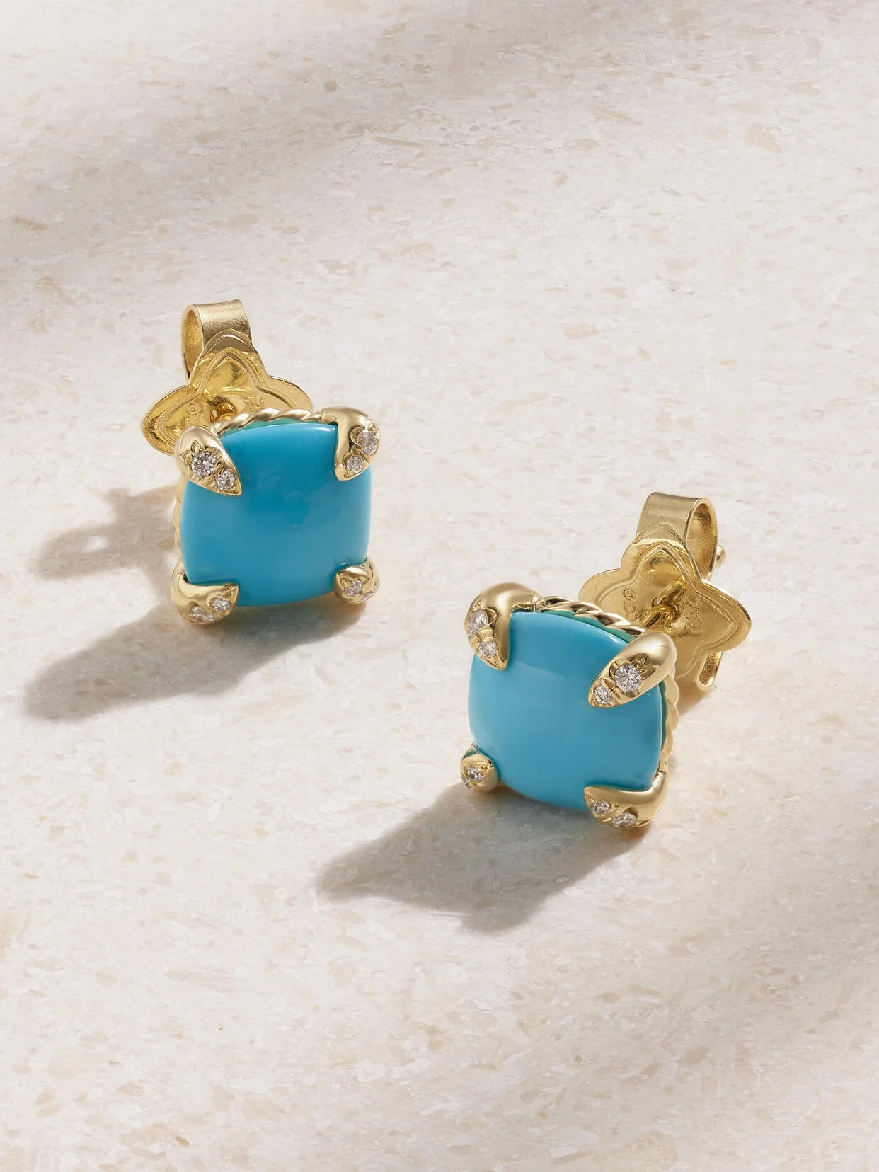 David Yurman's earrings are part of the label's 'Chatelaine®' collection, which is inspired by the designer's sculptural eye and his wife's love of painting and color. They're cast from 18-karat gold and set with turquoise and tiny sparkling diamonds in the claw prongs.