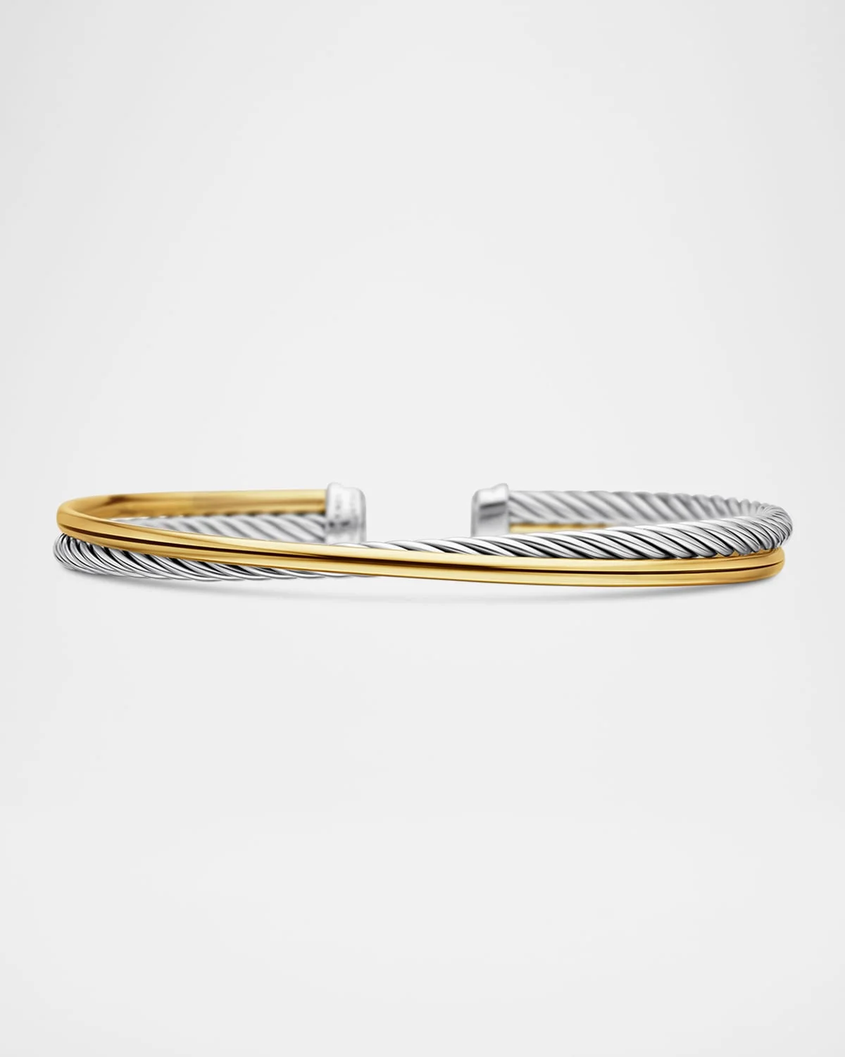 David Yurman bangle from the DY Crossover® Collection. Sterling silver cable with 18karat yellow gold. Split opening eases dress. Approx. 0.12"W (3mm). Made in USA.