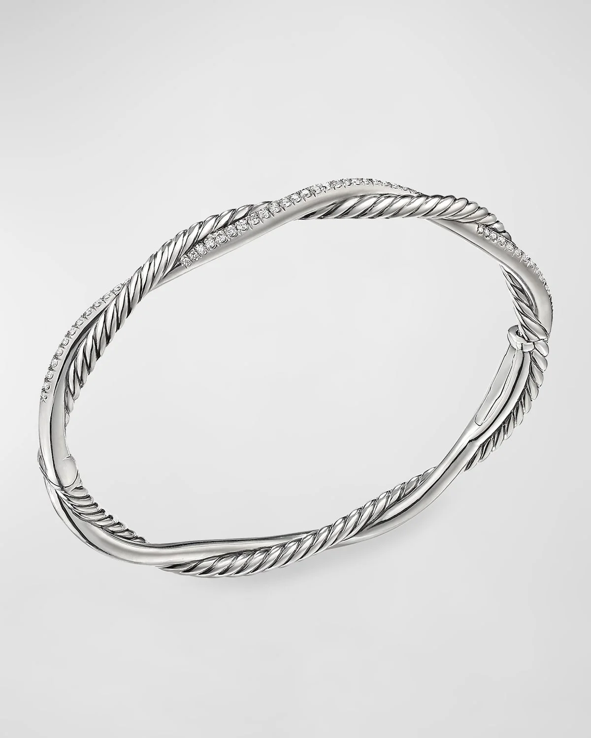 David Yurman twisted bracelet. Sterling silver hardware and settings. Twisted frame with diamond pave. 0.43 total diamond carat weight. Approx. 4.4mm. Imported.