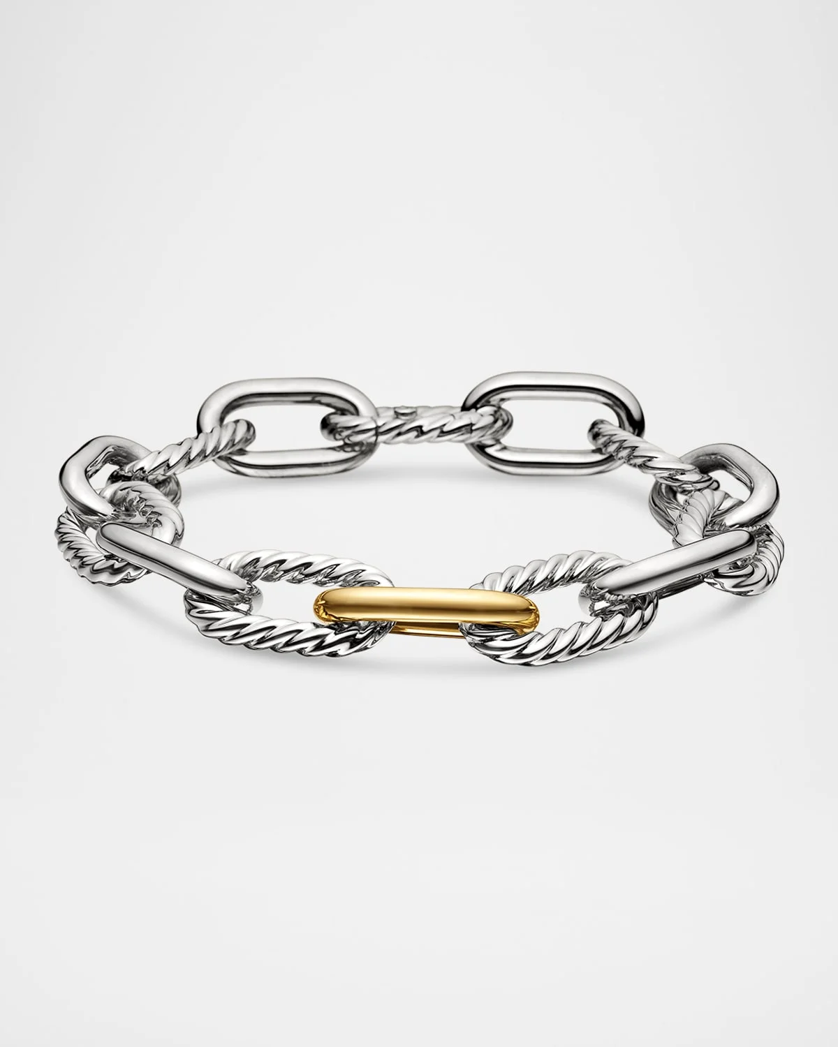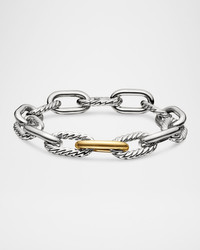 Madison medium link bracelet by David Yurman. Sterling silver and 18karat yellow gold links. Mixed links with polish and cable motif. Integrated cablepush clasp. Approx. 11mm wide.