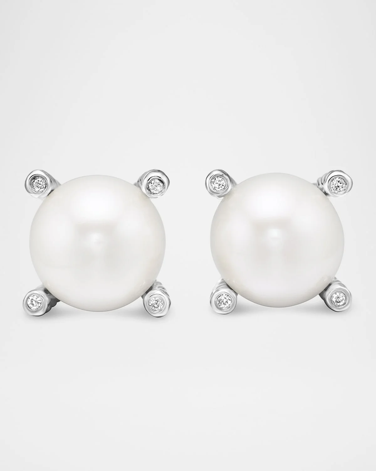 Sterling silver White cultured freshwater pearls, naturally hued, 9.5mm diameter Diamonds, 0.04 total carat weight Earring, 14mm diameter Post backs for pierced ears
