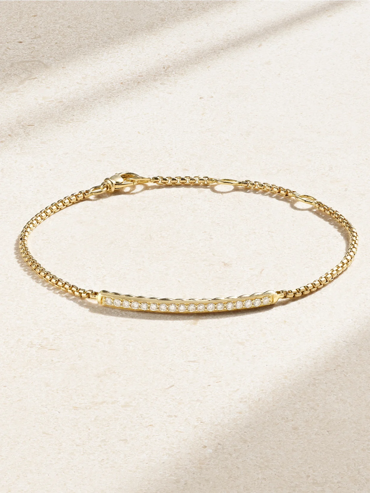 David Yurman's bracelet pays homage to the energetic atmosphere of New York City. Crafted from 18-karat gold, it has a slim center bar dusted with shimmering diamonds - look closely and you'll see the signature 'Cable' motif etched on the underside.