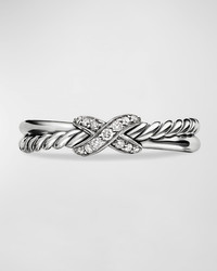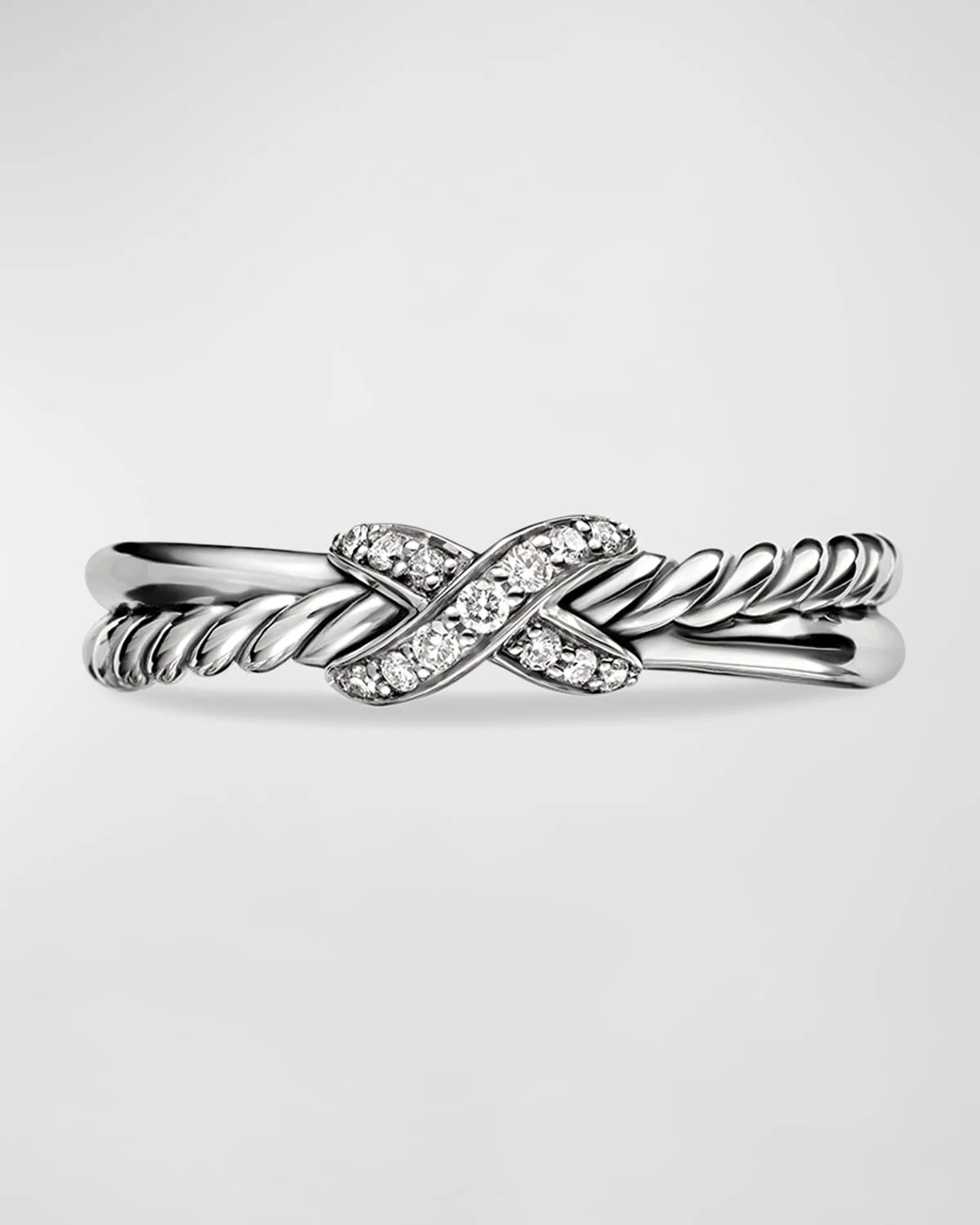 - X ring from David Yurman. - Sterling silver with diamonds. - 0.07 total diamond carat weight. - Approx. 4mm. - Size 5-9. - Imported. - Care Instructions: - Use the provided polishing cloth to gently wipe this item clean, then remove any remaining tarnish with mild diluted soap. Rinse with warm water, dry with a clean towel and store it in its jewelry pouch.
